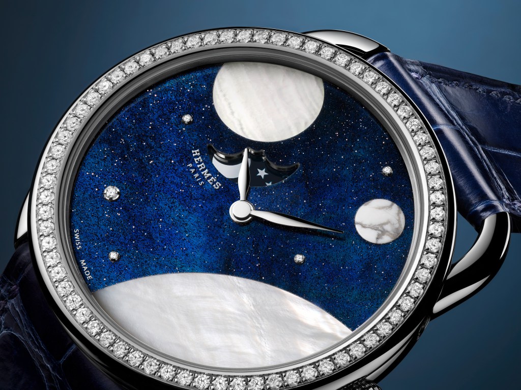 A sparkling cosmic scene composed of aventurine, diamonds, mother-of-pearl, aragonite and opal graces the face of the new Celestial Arceau Petite Lune by Hermès. The shimmering dial is as much an artisan achievement as it is a stirring artwork. Inside the white gold case (in the Arceau shape originally designed Henri d’Origny in 1978), there’s the Manufacture Hermès H1837 self-winding movement and the Petite Lune module—a demonstration of the distinguished brand’s commitment to fine watchmaking.