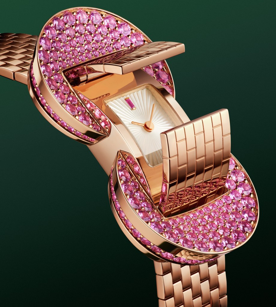 It is thanks to enchanting vision and meticulous craftsmanship of Van Cleef & Arpels that the word “wonders” stands alongside “watches” in the trade show’s title—from their mesmerizing, magical automaton (one of which is featured as the hero image for this article) to the transportive decoration of their on site booth, which was dressed in thousands of Murano glass leaves. Some of their releases, like the Ludo Secret Watch, manage to be both. Two rose gold circles, adorned with pink sapphires, are the key to revealing the watch face on this fine jewelry masterpiece. When pushed toward one another, two panels on the bracelet lift above the guilloché white mother-of-pearl dial.