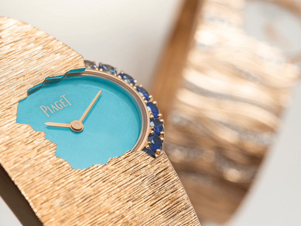 Though the playful swimming-pool blue color of the turquoise dial might be the first attribute to catch the eye, it’s the texture of the 18K rose gold bracelet on Piaget’s stunning new Limelight High Jewelry watch that is the most sensorial. To the touch, the gold cuff feels very much like fabric thanks to an ornate goldsmith engraving technique (where each line is done by hand) that masks the links and lends an organic, velvety flow.
