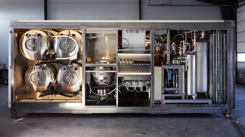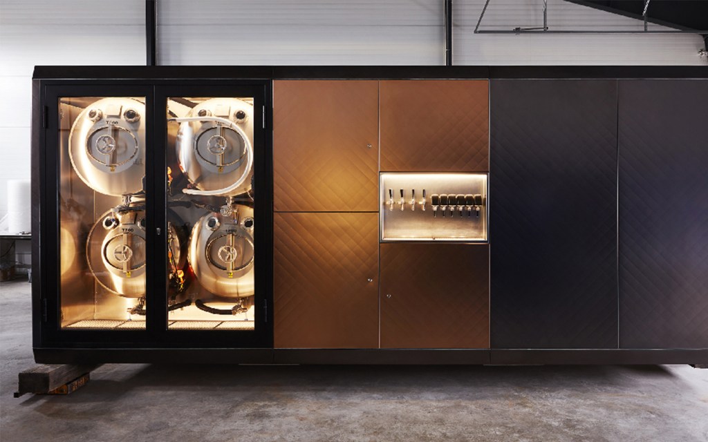 At the moment, our micro-factories can make perfect quality still and sparkling mineral water, an almost unlimited range of soft drinks, smart drinks and functional drinks, and various brews, like craft beer, craft ciders and kombucha. The brewery is fully automated and—at this capacity—probably the most compact one available on the planet today. We only brew from extract, meaning we skip the malting and worting processes and start our brewing from the wort extract. This saves time and space and money—and energy and CO₂.
