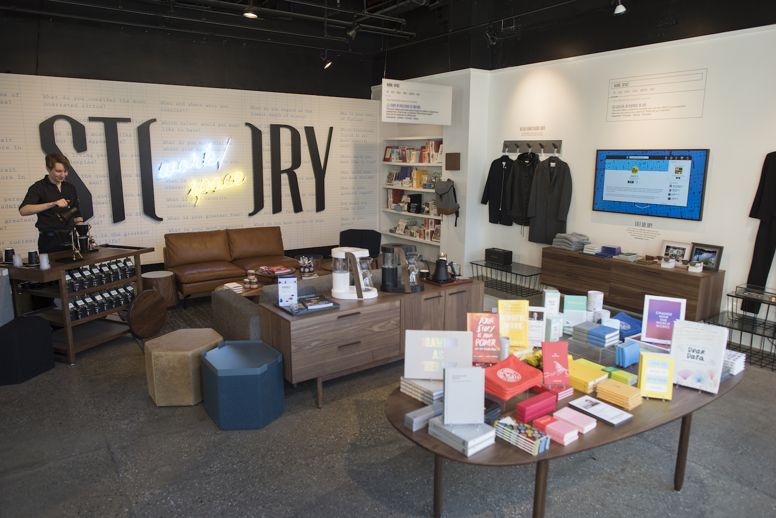 Walking in off the street, visitors enter the Gallery, which is intended to spark inspiration and have individuals consider their purpose, intention and identity. With examples of deep work produced in the machine, the Gallery provides encouragement and motivation. Dewane also calls this “positive peer pressure,” which encourages workers to make their colleagues (and themselves) proud. This area is peppered with products from Alain de Botton’s The School of Life, Grovemade, The Arrivals and MM.LaFleur.