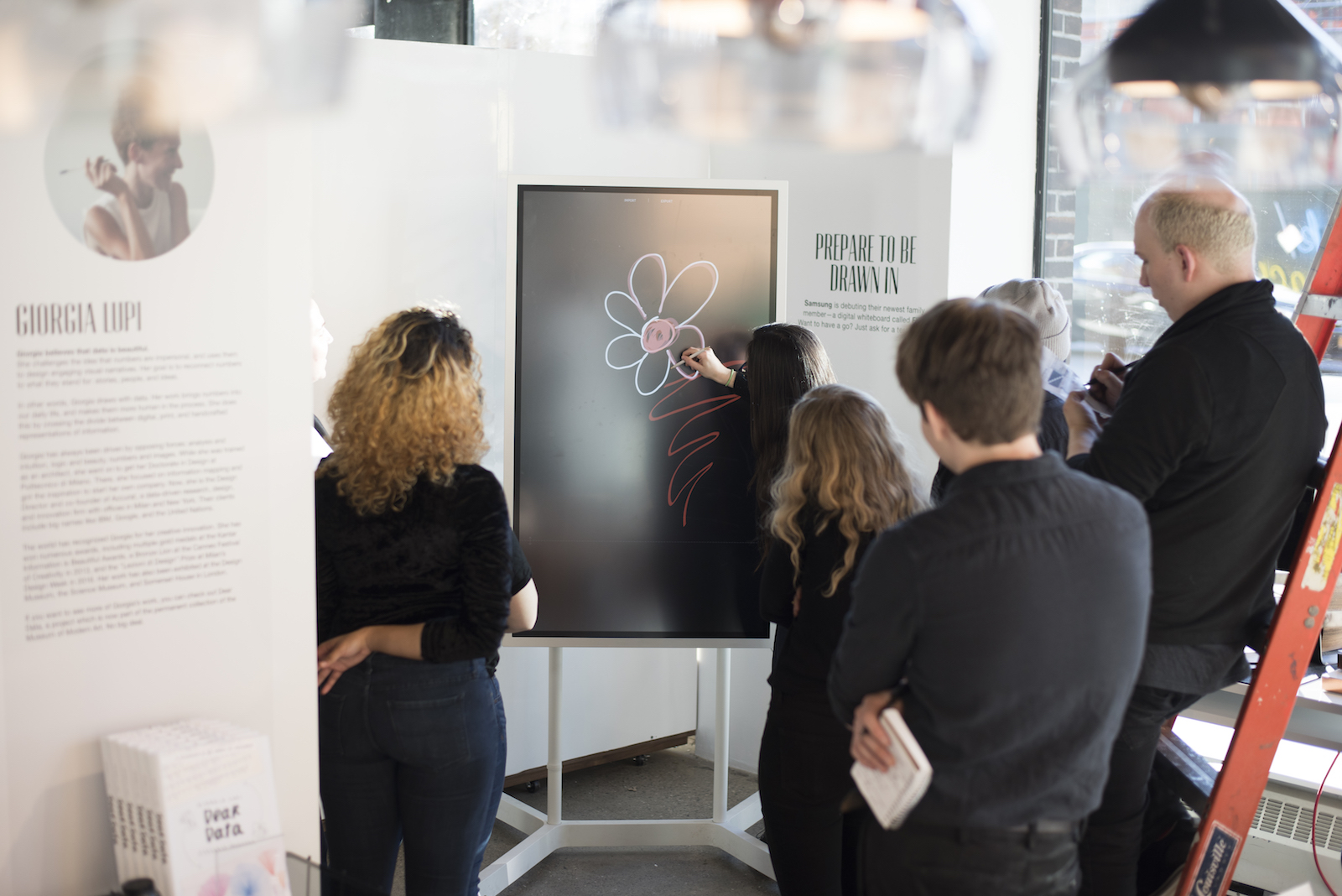 Rather than a regular whiteboard, Samsung’s Flip (an interactive whiteboard) is debuting at STORY. Visitors can tinker with the Flip, and those who have signed up for desk space can use it for their own work. When we visited, Dewane used it to draw the curve of people moving through the space—explaining to us the flow of the space and vacillation between inspiration and focus.