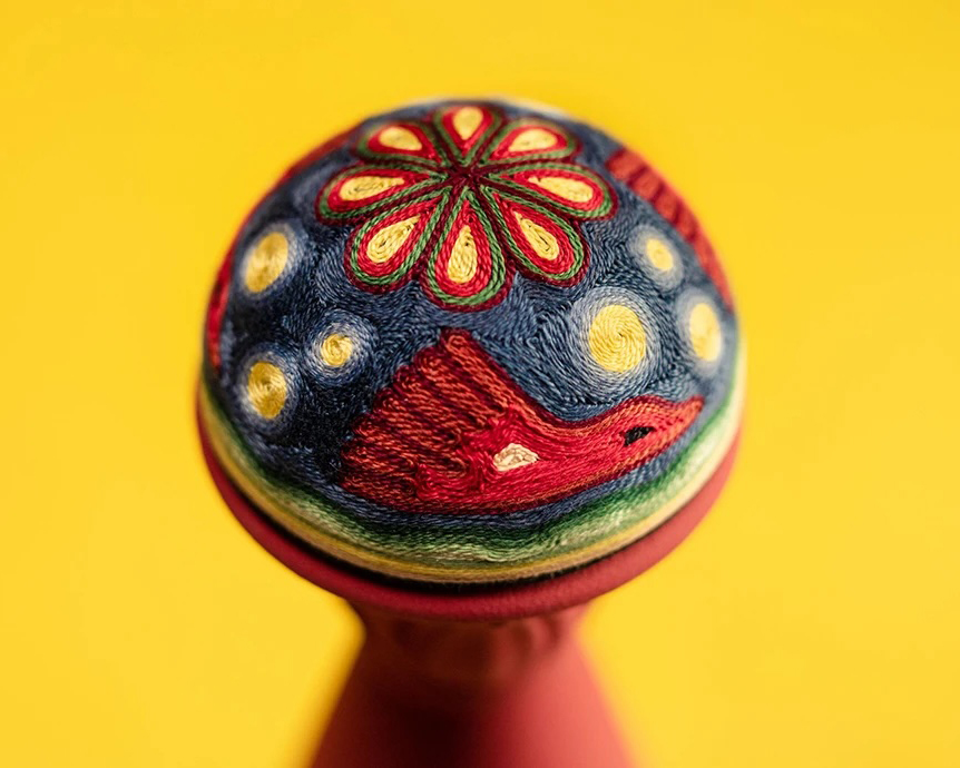 The cap is handmade by Mexican artisans using a technique that creates intricate designs using colored yarn and represents the mythical red finch in light under a starry sky, keeping vigil over the dreamlike landscape of the desert mountains and valleys where the Huachichil people used to wander.