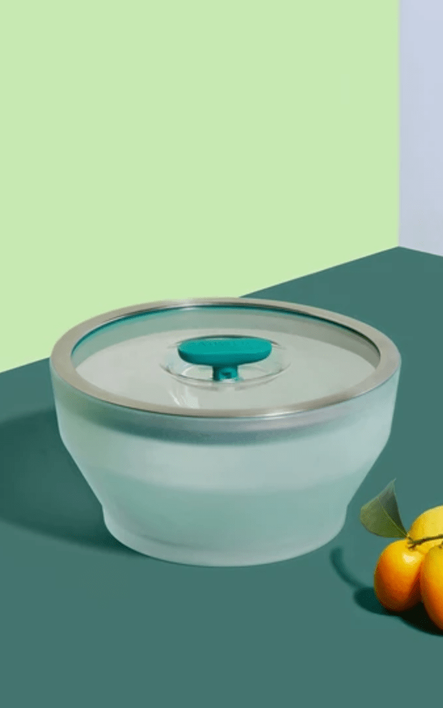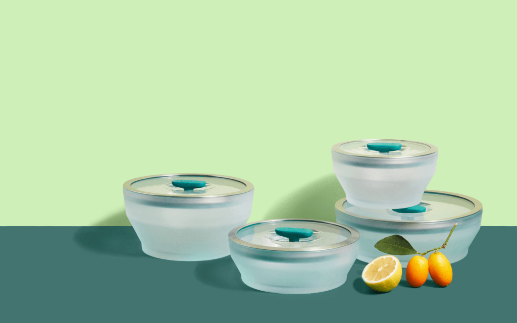 All of Chen’s design decisions aim to enhance the humble appliance’s abilities. The bowls—made with frosted, heat-resistant borosilicate glass—retain heat and won’t release toxins over time. The lids—made with that same glass, as well as platinum-grade silicone and microwave-safe stainless steel—traps steam while releasing excess pressure (that means no messy explosions). The simple shapes and frosted glass make the bowls attractive enough to use as serving dishes. Plus, each piece is dishwasher-safe and the lid knobs push down for flat stacking.