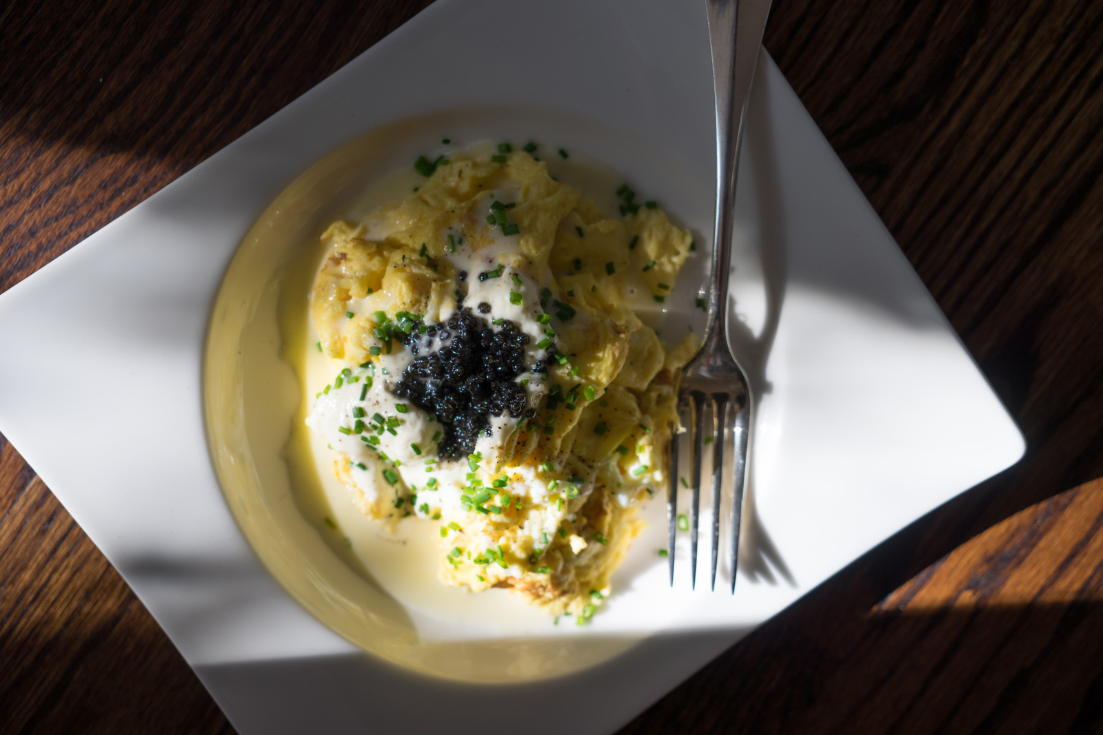 Instructions: Whisk eggs with salt in a bowl. Heat olive oil in a non-stick pan over medium-low heat. Add eggs and let cook, consistently stirring to avoid burning. Add heavy cream and continue to stir the egg mixture until combined and softly cooked. Plate when cooked to preference, serve with a large dollop of sour cream, caviar, and a sprinkle of diced chives.
