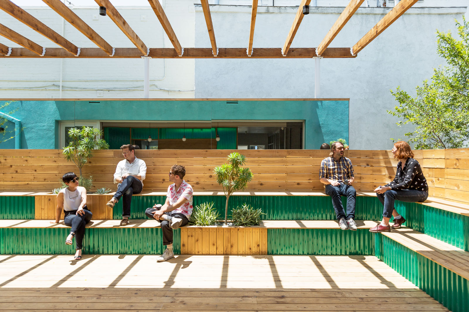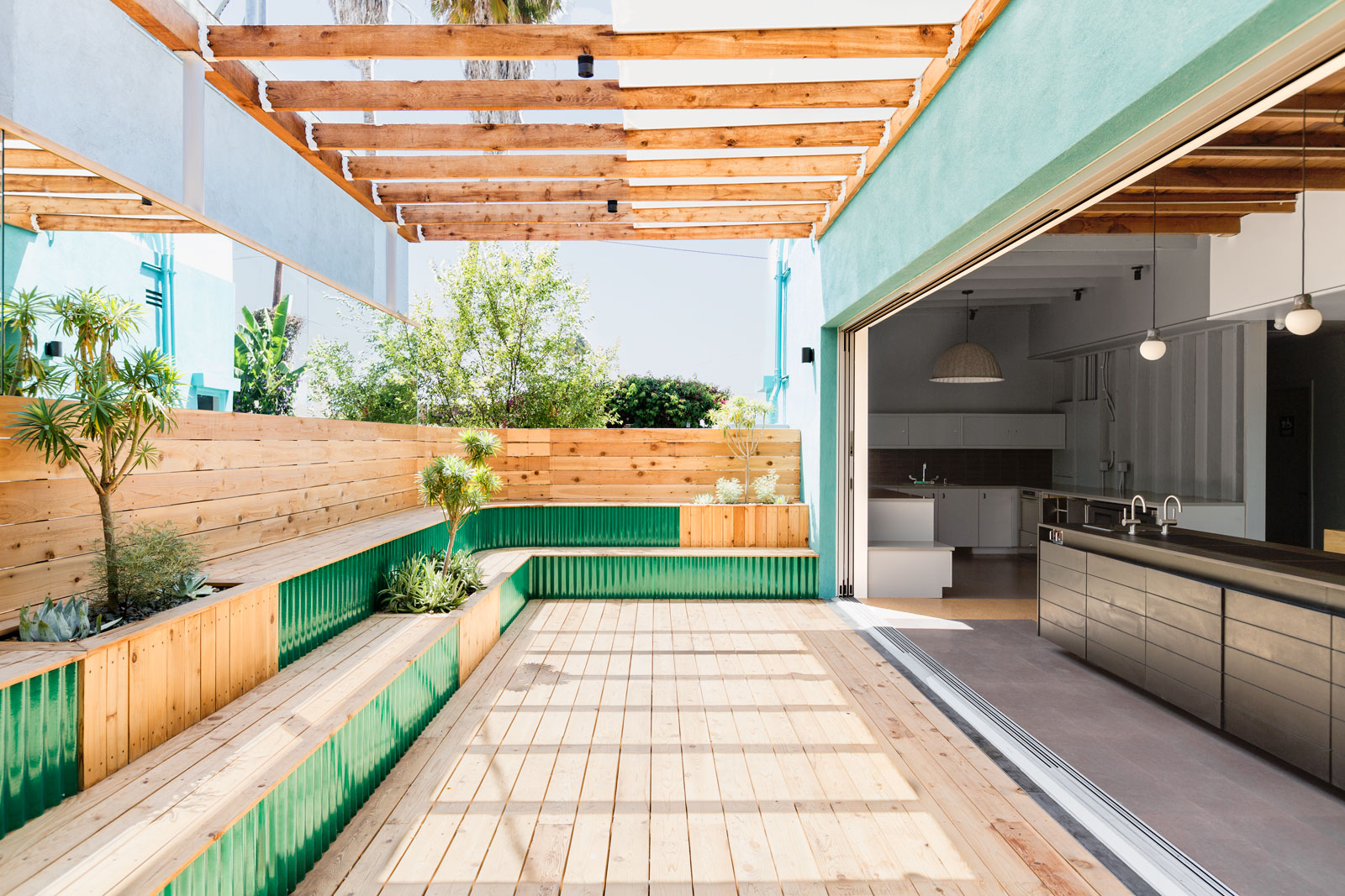 “The existing bones of the space had great character that we wanted to preserve, specifically the Art Deco exterior detailing, bright color scheme, and the orientation of the front door and porch,” says Rudolph. “We wanted to create an indoor/outdoor classroom and garden between the building and its neighbor on Sunset Boulevard. Removing most of the interior walls and opening up the south side of the building to the new covered deck created a double axis of both spatial orientation and circulation that allows for flexible possibilities.”