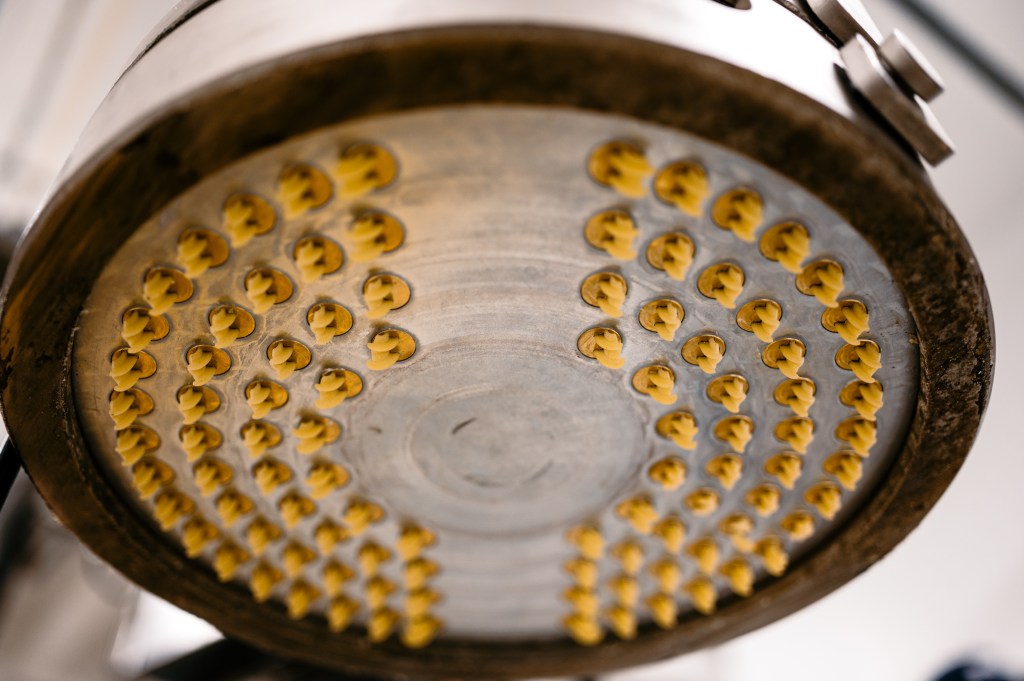 Getting the die made was by far the most complex part of the journey. There are very, very few bronze pasta die makers—in fact, there’s only one in the US—and getting them on board, in the middle of a very busy pandemic-fueled year of high pasta sales required a lot of time and finesse. With a new die pushing out the timeline by more than a year, Sfoglini offered up a die that had been retired and could be retooled. As this is a new shape there’s no easy way to have it be perfect the first pass, so several rounds, each very expensive and time consuming, were required to produce the shape of Pashman’s dreams and were potentially project killers. Through a lot of perseverance, charm, patience and the desire to create something new, he and Sfoglini persevered and Cascatelli was born.