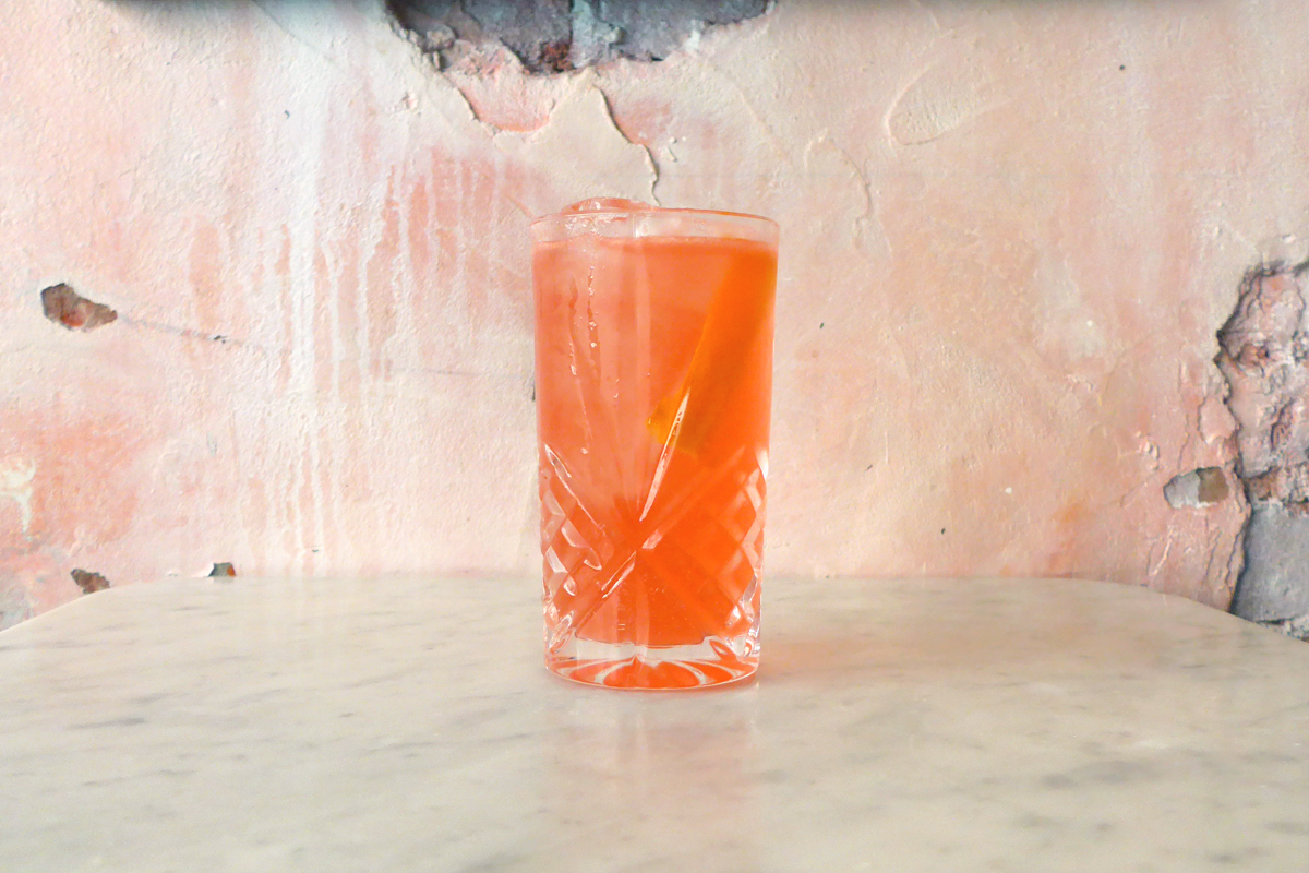 Shake ingredients together, pour into a highball glass, top with soda and dump orange oils to finish.