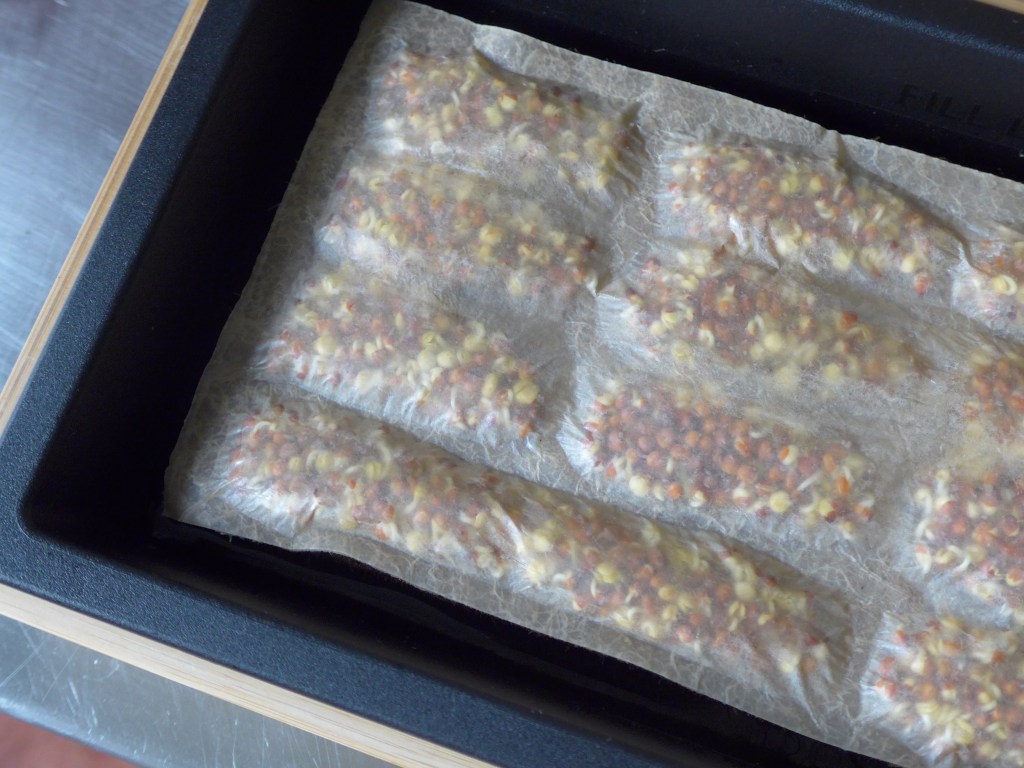 Simply fill up the tray with water, tuck their Seed Quilt in, and find a spot for it (it doesn’t need much light, even a place where there is simply a ceiling light will work), and the fruits of your minimal labor unfold before your eyes with noticeable growth daily. With the warm summer weather, the seeds seem to grow even faster: we placed the mat of daikon radish seeds in the tray Monday morning and harvested them on Friday morning. They are a sharp, peppery addition to various homemade dishes.