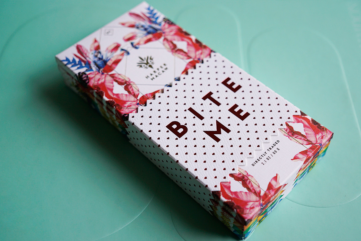 Lifting the back tab in the colorful paper boxes, rainforest animals lead the way to the chocolate protected by a compostable foil wrapper. The geometric bird logo and score lines are also printed onto the bar, echoing the package and product design by fellow DCers Design Army. “We wanted to make sure the experience from the outside carried through to the inside,” explains Pum Lefebure of Design Army.