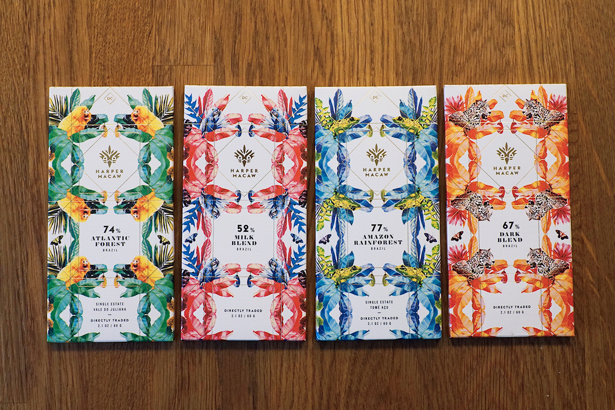 Entering the burgeoning world of artisanal chocolate with a flourish, Harper Macaw‘s Washington, DC-made bars capture attention with their kaleidoscopic packaging. We were enticed to open the crisp, colorful boxes but ultimately more pleased to savor the complex flavors of cacao—sourced from the rainforests of Brazil—that we found within.