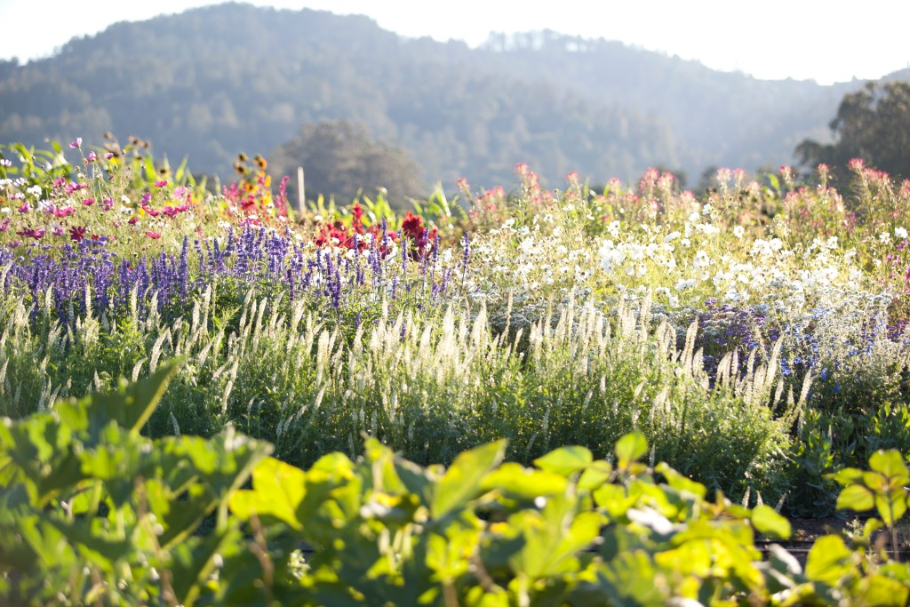 On their 13-acre Point Reyes property, Hull transformed the loafing barn into a greenhouse-style tasting room filled with flowers and plants. A grassy field that was once for the cows is now being solarized to make way for a meadow of wild flowers for their bees.