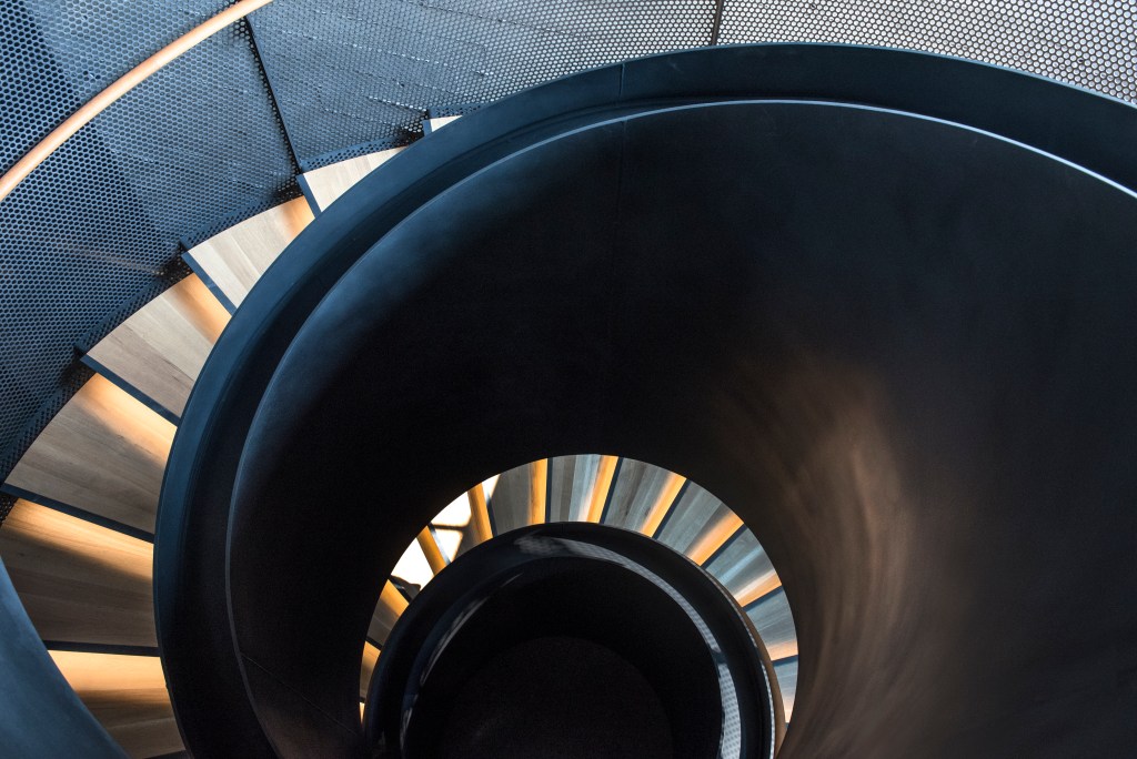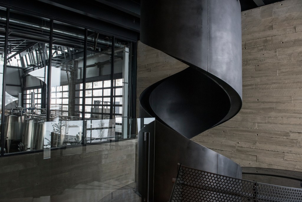 The outside of Martin’s Lane winery is partly covered in rusted steel designed by Vancouver-based Drabek Technologies. It’s an homage to the forest that was suffering from wildfires sweeping through the area in 2003. It’s a powerful inspiration, and part of a facility that makes constant reference to the world around it. For instance, the front door is designed as a representation of the architectural layout of the winery. Inside continues with a spiral staircase resembling a wisp of smoke, once again—drawn from the wildfires. The leather-clad handrails took two weeks to sew on, by hand.