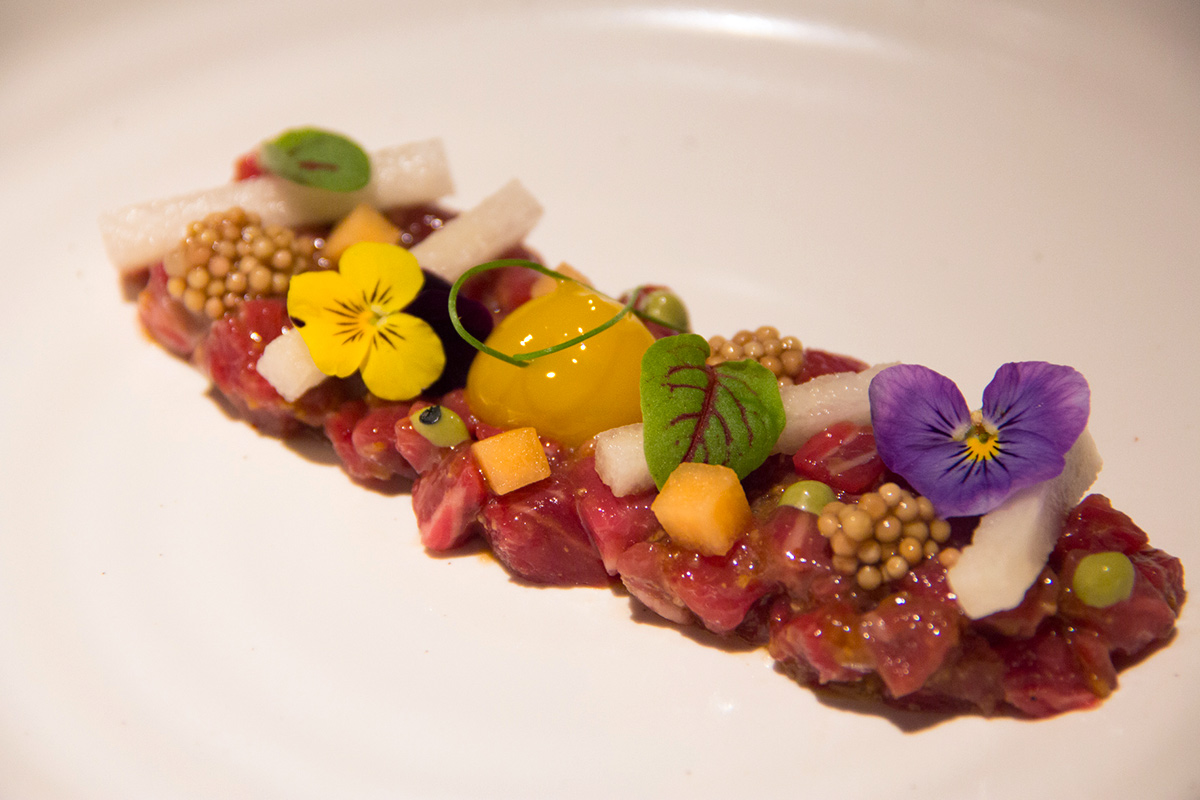 In true Korean style, dishes are meant to be shared. The beef tartare appetizer with pickled mustard seeds, Asian pear, pickled cantaloupe, ramp aioli and egg yolk upgrades the popular dish yukhoe (which could win an award for least photogenic dish served at Korean restaurants) into an edible work of art. Fried chicken becomes a light and crisp affair, thanks to a tapioca flour batter, with a kick from jalapeños and spicy soy vinaigrette.
