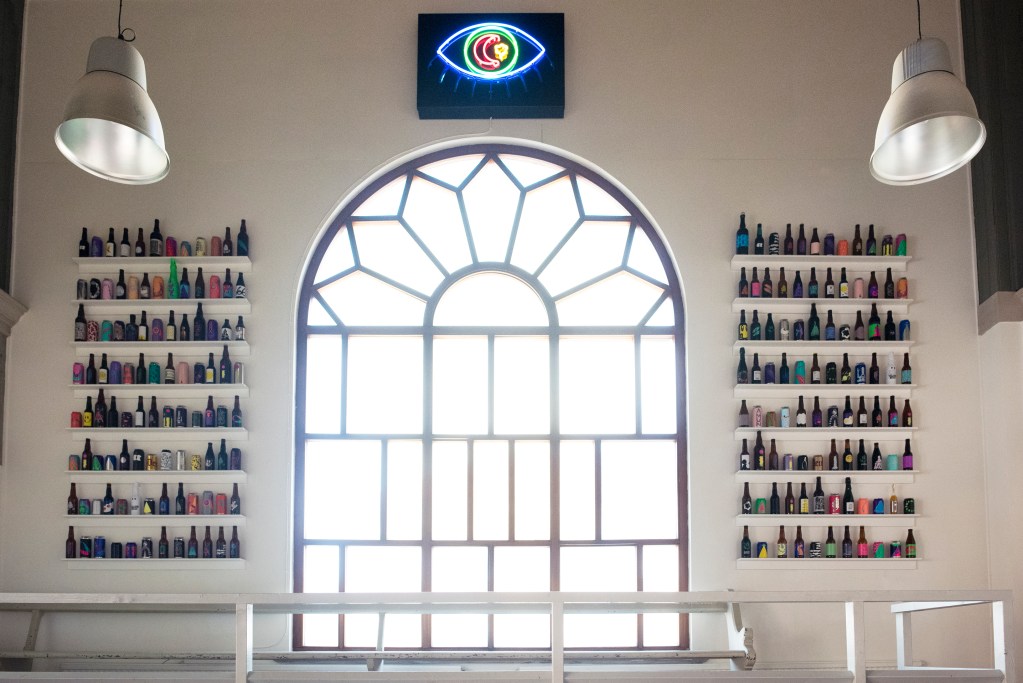 Housed in a former church, the space retains much of its original character. Its transformation, however, reflects the creative output of its founders—with neon lights, murals and hanging artworks by co-founder and artist Karl Grandin. “We searched for a suitable location for almost three years,” Fentie tells us. “Karl had an exhibition here in 2019 and the whole Omnipollo team felt this was the place.” Omnipollo has operated a handful of bars up to this date, but this opening stands as its first eponymous brewing facility.