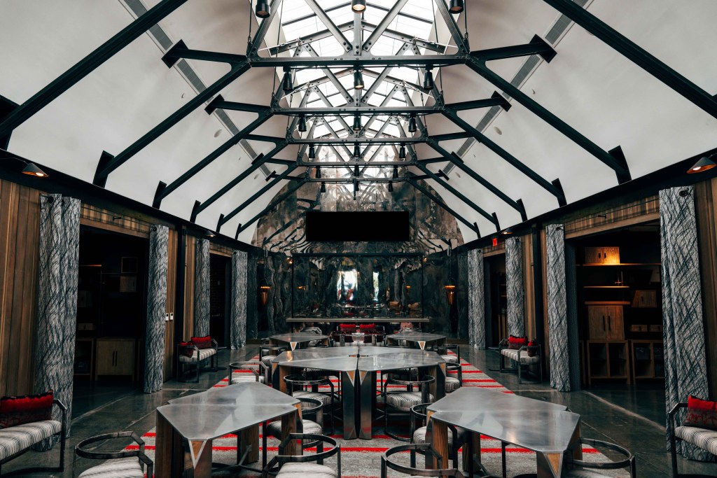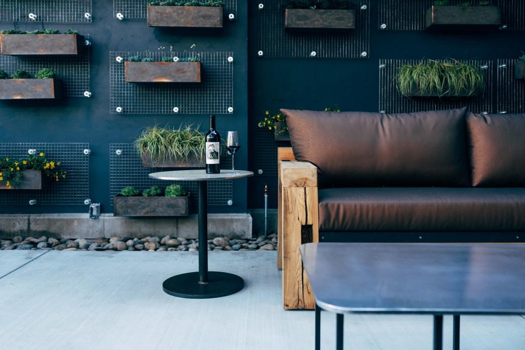 Inside, nearly every surface is black or gray, accented with reclaimed metal and timber. Prison references—like chains and handcuffs—are incorporated into the decor, and the only prominent pop of color throughout the whole space is blood red. That said, the interior is anything but bleak. Inspired by the composition of The Prisoner’s label, Hollis installed a nearly 60-foot skylight when he vaulted the ceiling of The Makery (formerly Franciscan’s wine library). The courtyard features rattan chairs, a living wall and gender-neutral bathrooms.