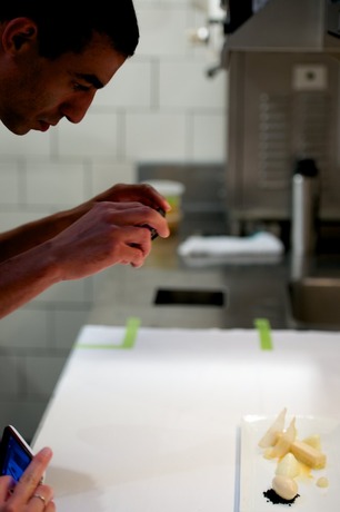 Interior of the dining room; Pastry chef Milton Abel snaps a photo of the dessert