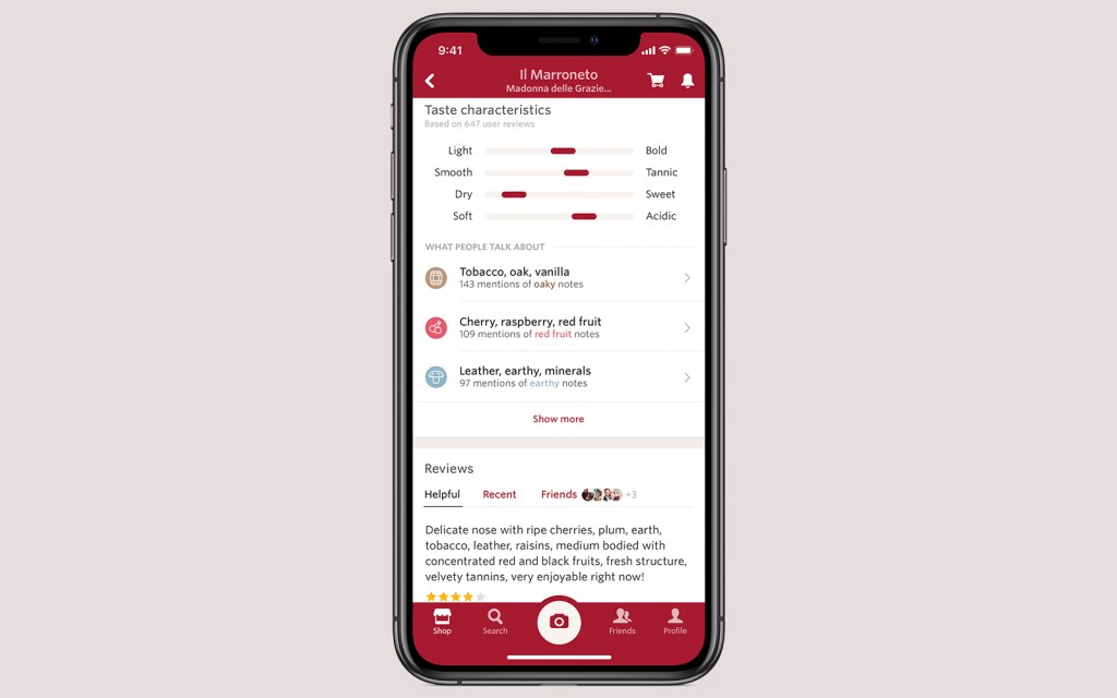 With a user count of 40+ million, over two million wines are looked up on Vivino each day. And there’s no limit to how many wines each user can submit—no matter if it’s a bottle from a well-known producer or an obscure vintage from a defunct vintner. The variation in each wine’s profile page comes from how many times each is reviewed. Taste characteristics are culled in a way that recognizes the frequency in which a word is mentioned. For a Joh. Jos. Prüm bottle of 2013 Riesling, for instance, there are 112 mentions of “earthy” notes.