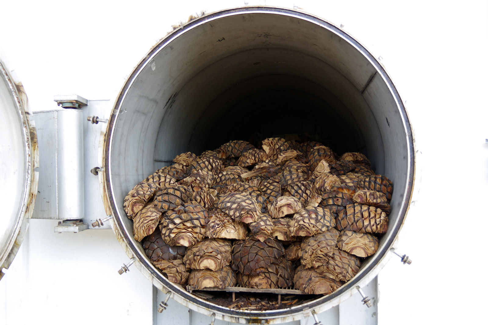 Romero Mena’s process is incredibly nuanced. The Volcan Blanco is 75% slow-roasted lowland agave, heated in a traditional stove for 44 hours and crushed on a stone wheel. This is ultimately blended with 25% highland agave that’s cooked for 12 hours. The latter holds more water but has a lower density of fibers, which is why it yields a fruitier flavor. Romera Mena experimented with various types of yeast for fermentation, settling on champagne and rum yeast. Everything is then distilled in a copper still and distilled again in stainless steel before left to rest for 30 days. Liquid that will become the Cristalino expression is then aged.