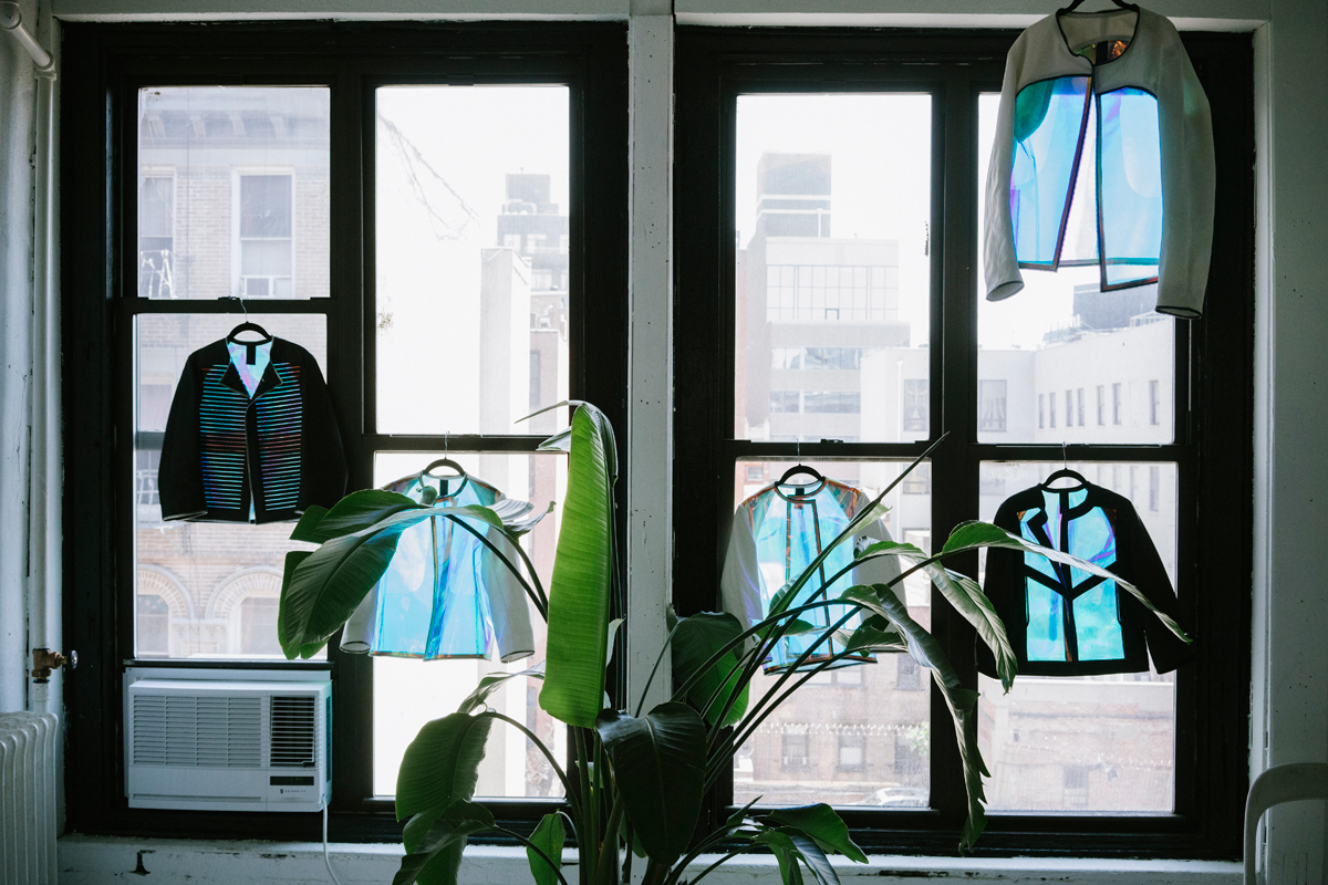 The designer’s initial exposure to luxury clothing came while instructing global design houses on the handling and commodity aspects of exotic skins. Her own line of garments, constructed with that luxury DNA, borrows from specialized techniques for letting out “strange materials.” The brand’s most iconic pieces feature light-responsive holographic panels sourced from architectural glass finishes and treated in several stages before becoming pliable to garment construction. It’s a material through which touchscreens are operable.