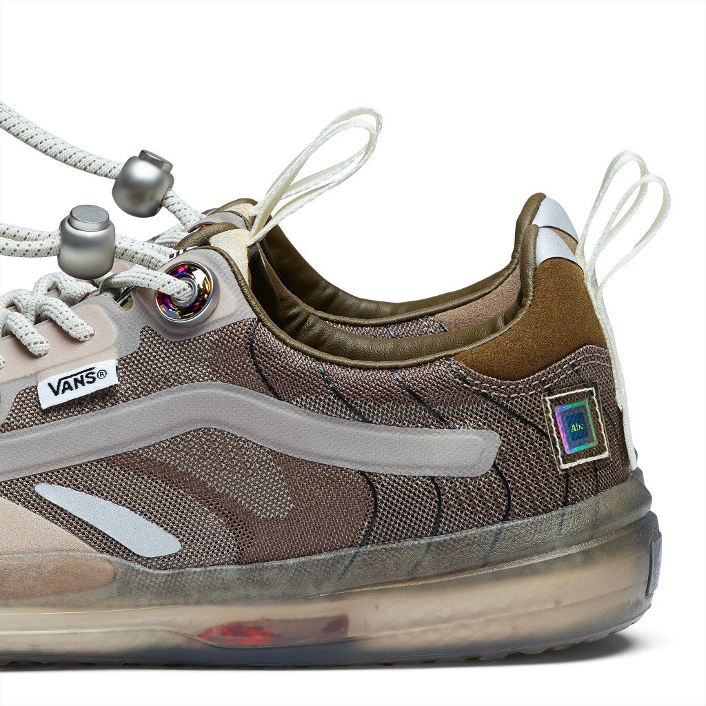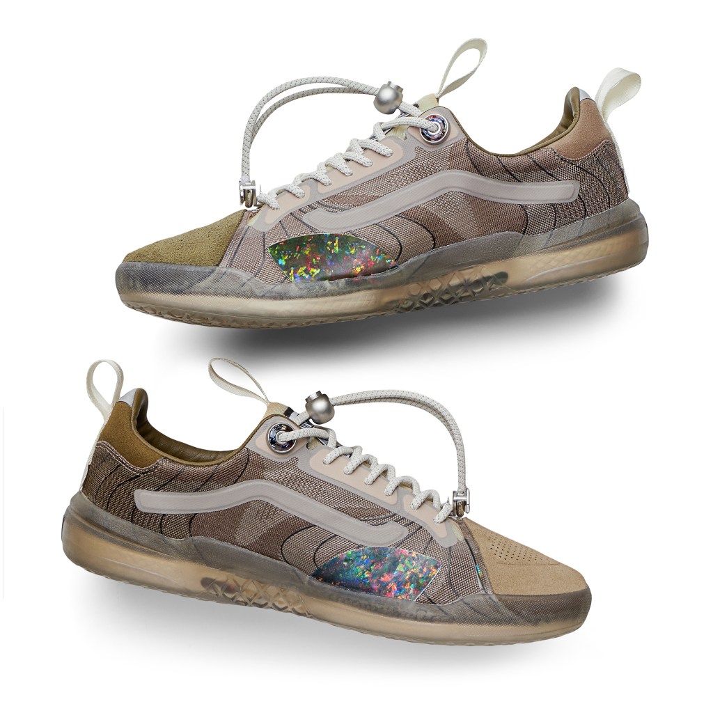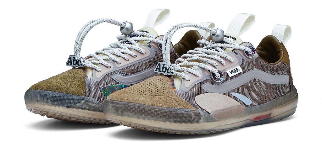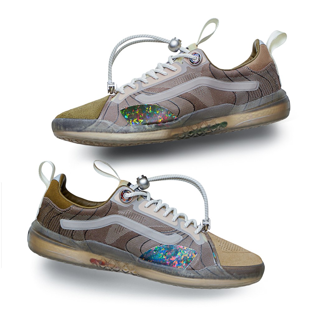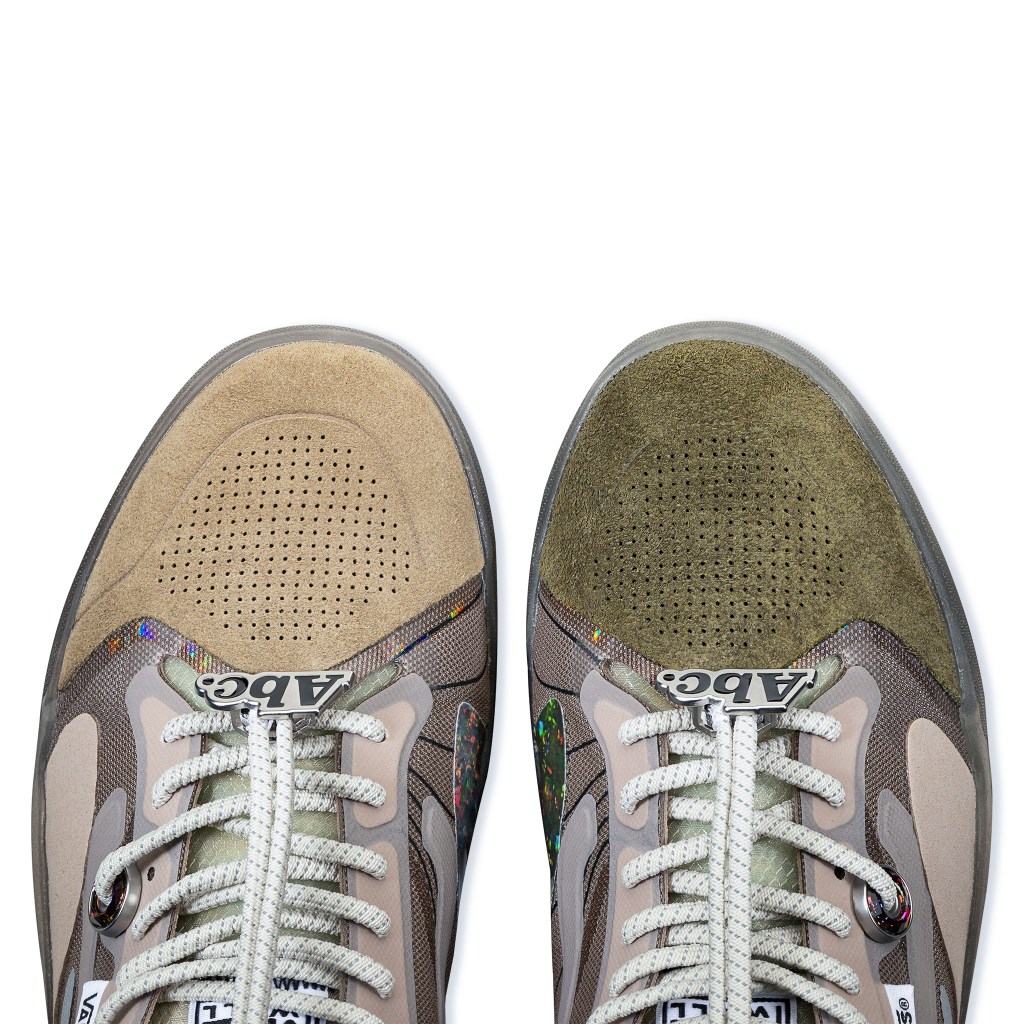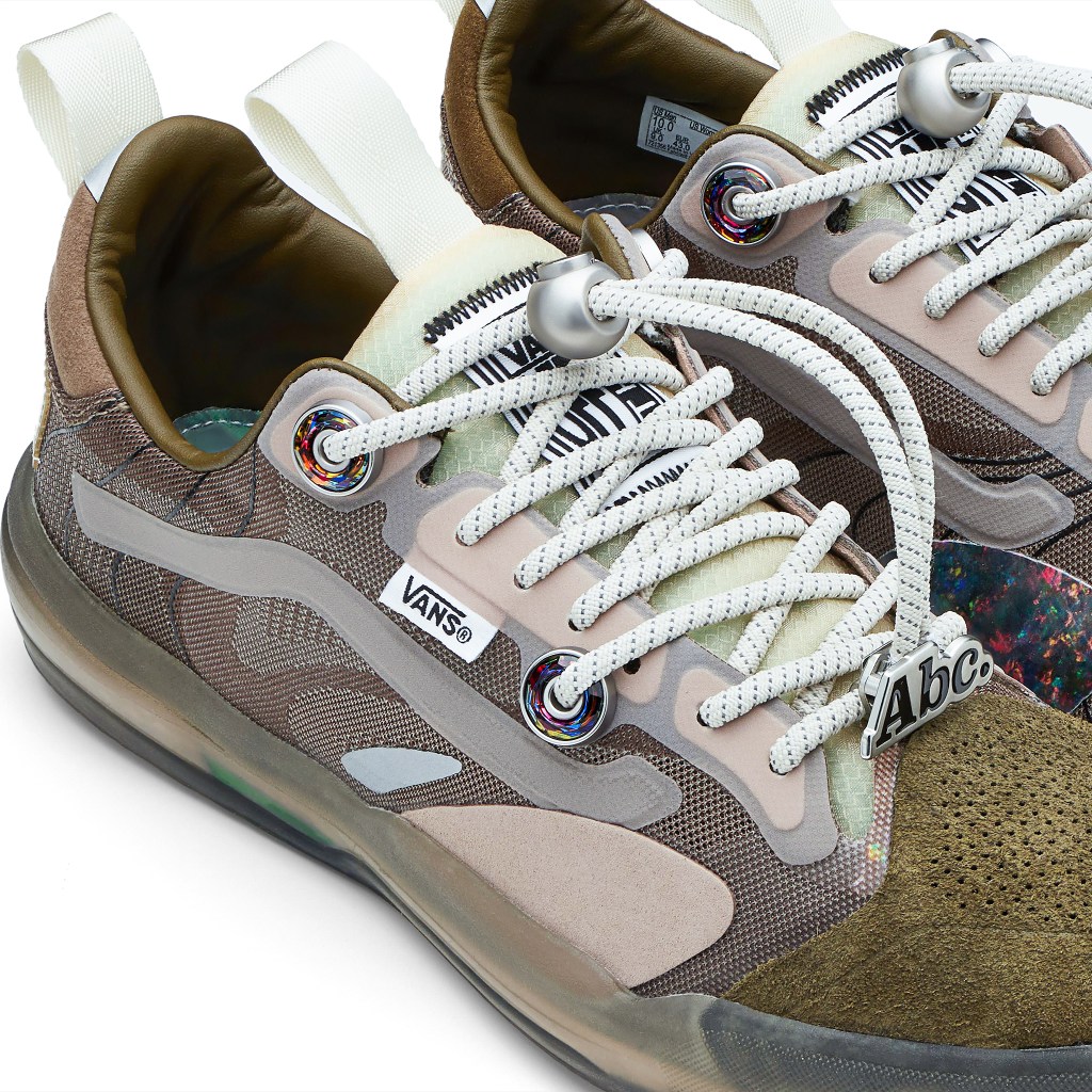 At the core of this collaboration is the EVDNT, a newer shoe model from Vans, which has undergone a dramatic transformation under the artistic influence of Abc. Drawing inspiration from the kaleidoscopic effect of fire opals, the shoe mirrors its multi-hued shimmer and depth. The technical construction of the EVDNT was ideal for this re-imagination, allowing for intricate layering, innovative transparency, and the blending of a medley of materials to capture the abstract essence of the stone. Cobranded easter eggs hit on the shoe and packaging at an unprecedented level of collaboration for either brand.