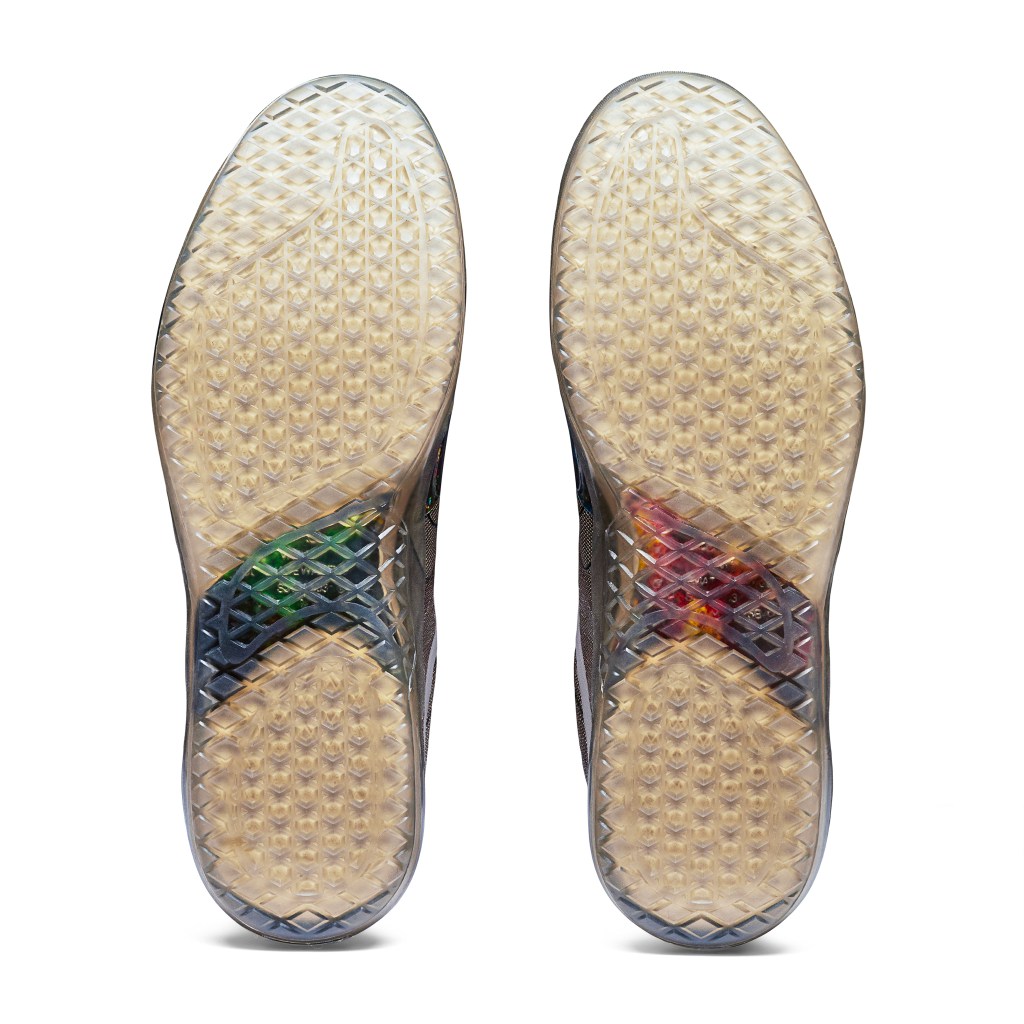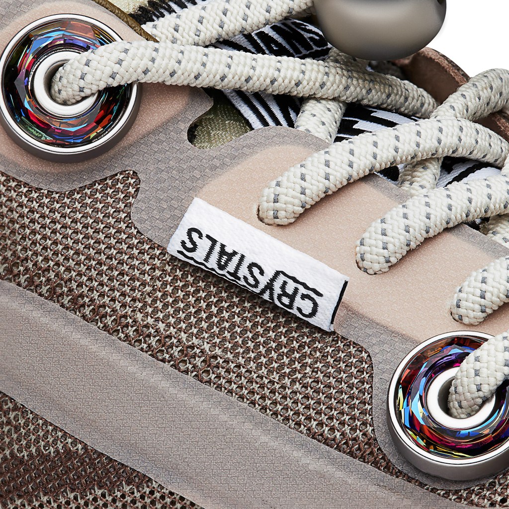 Attention to design detail is palpable throughout the shoe. Custom Swarovski eyelets provide a hint of elegance, while varying suede colors, mesh tones, transparent holographics and opal patterns come together to evoke the shoe’s sculptural, gem-like feeling. The matte silver components complement the riot of colors, while the vegan leather lining ensures wearability isn’t sacrificed for style. An Abc lace lock cleverly transforms the EVDNT into a slip-on, ensuring it’s not just an art piece but a practical wardrobe addition. And with transparent holographic covers on the foot bed insoles the idea of a direct connection to the stone is suggested.