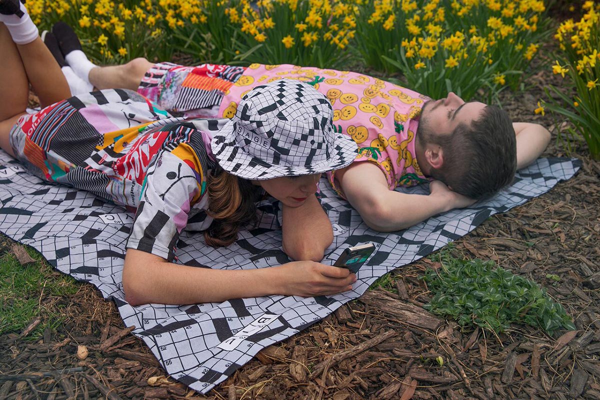 Brooklyn-based Annie Larson’s ALL Knitwear line has become much-loved for its high-contrast colors and chaos of patterns. Each sweater is made to order by Larson herself, on her knitting machine. For those who can’t wait until fall or winter to be bundled up in a vibrant Larson creation, there’s actually some good news. The designer was recently approached by DIY platform Print All Over Me (PAOM) for a summery knit-free capsule collection that’s playful and pure Larson. Featuring prints that range from crossword puzzles to smiley faces and palm trees, Larson’s collection of apparel hits the perfect balance between casual and statement-making.