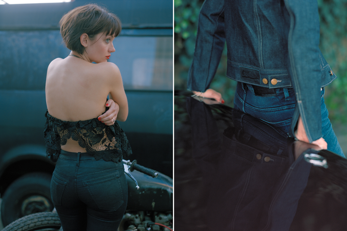 “It was important to us to find a balance between function and femininity,” Pearce tells CH. “It’s also fucking cold in England and we want to stay warm, which is how the fleece-lined jeans came about. We needed comfort and movement, and wanted to provide clothes for women who were out there being active—be it cycling, riding or outdoors in general, that still looked cool.” Bell has a background in leather and lingerie design and is behind the Almeida London Lingerie brand, while Pearce has worked with denim for 10 years, designing for industry heavyweights Levi’s and Edwin.