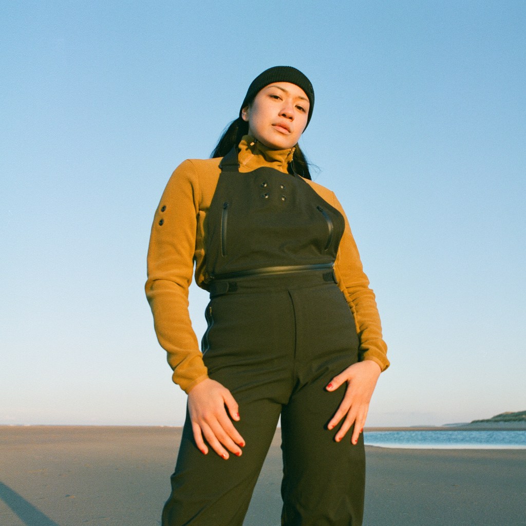The apparel is also all modular. The garments can easily be styled together or layered on top of one another. In the Snow:Cycle Capsule—which is all made from deadstock Japanese soft-shell fabric and Dermizax technology—the Bib Overalls function as an insulating layer while on the slopes, or biking pants when the bib and detachable suspenders are removed.