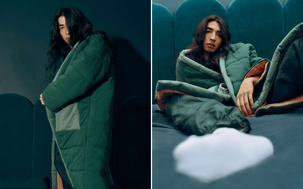 Four years later, the two likeminded brands reunite for a special “Dogwalker” edition of the Homecoat—a one-size-fits-all piece in two gentle shades of green. We spoke with both camps about how the collaboration came to be, cannabis, coziness and what “wearing an edible” feels like.