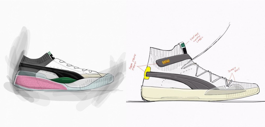 Before joining PUMA, Sallee was already working this way. The sketches from his therapeutic project were not shaped by wear-testing or performance metrics. He was conceptualizing sneakers based on intuition from prior playing experience and what interested him as a consumer. “The Clyde Hardwood and the Sky Modern were both based off of things I did before I got to the company,” Sallee says. “It actually worked out so well. It’s funny how that happens. You know, companies don’t usually show any of their things until they come out. Technically these were sketches that were already done, and had been out there.”