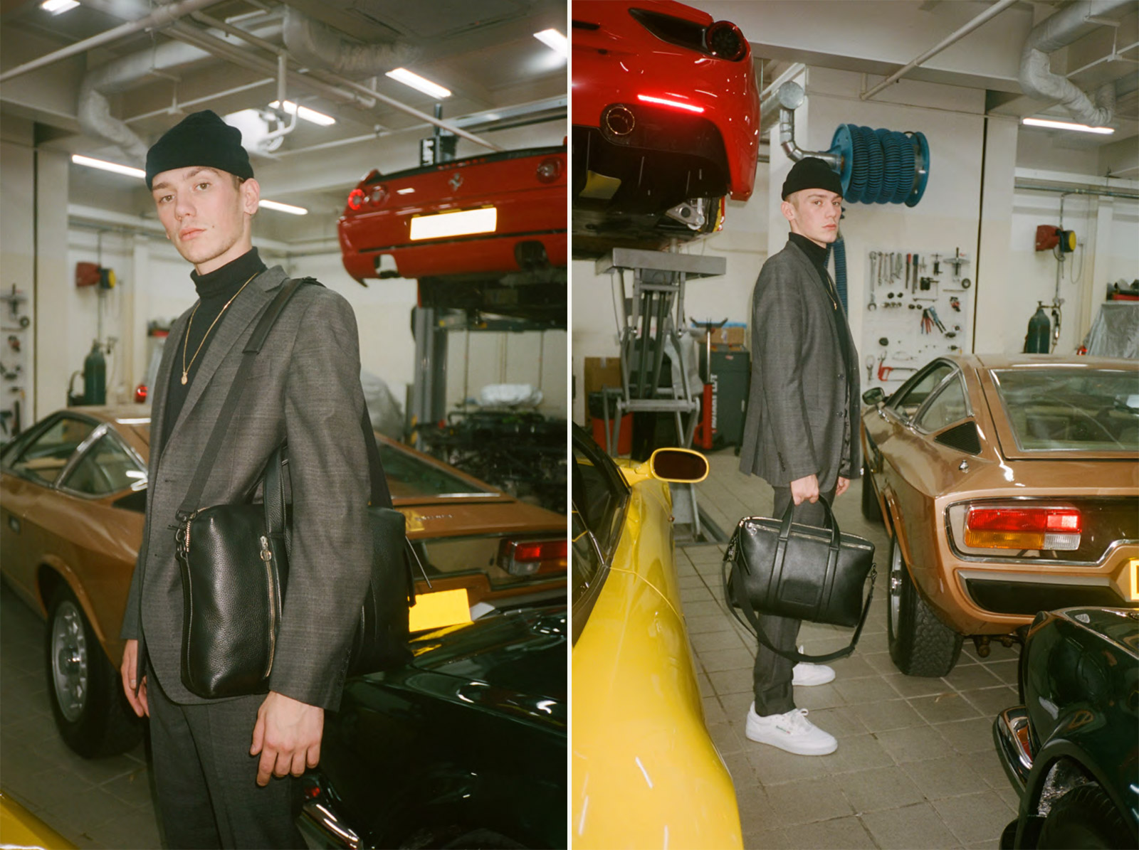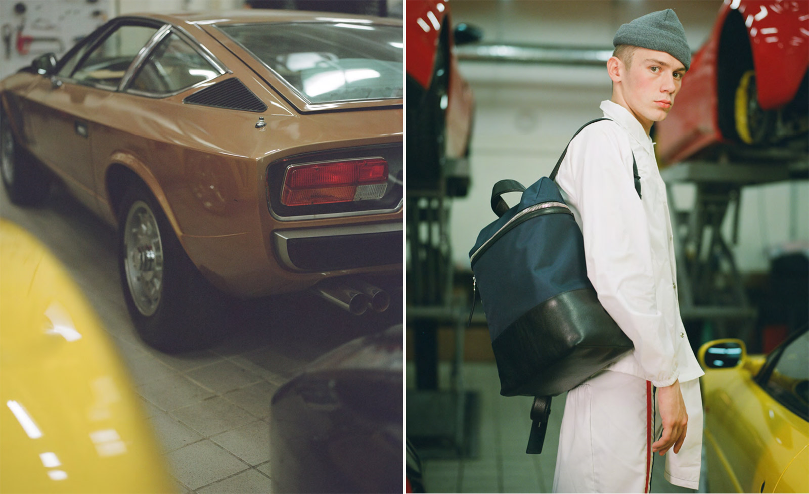 Cars and racing are intrinsically tied to the DNA of KARA. “There was something about the bags, the imagery and the feeling I wanted to create that went back to my dad. ‘C’était un Rendez-Vous,’ a 1976 film by Claude Lelouch. Shot in a single take, the nine-minute film is of a driver grinding through Paris at breakneck speed in the early hours of the morning. That film contrasted with Wong Kar Wai’s ‘Fallen Angels’ were on my mind,” she says. “I wanted to create bags with a crisp sport quality and contrast them in photos with a rougher, nostalgic feel. Bringing everything together, I had the opportunity to shoot our campaign images at a super car garage in Kowloon Bay, Hong Kong—along the streets where my dad used to race.”
