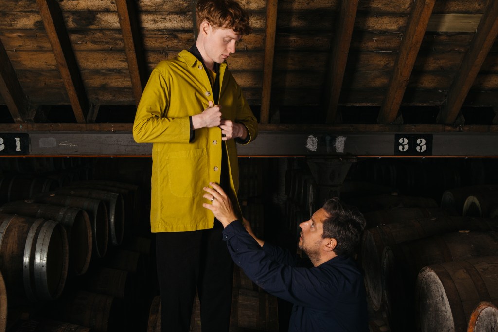 Hare had already decided to team up with Scottish mill Halley Stevenson to explore the traditional technique of garment dyeing for the new collection, using machinery that had been dormant for decades since the days when the mill produced Levi’s jeans. Working with skilled technicians, his team was able to dye a new style of shop coat in two shades that perfectly match the hues of the 10-year-old Curiositas and a four-cask matured 21-year-old non-peated whisky.