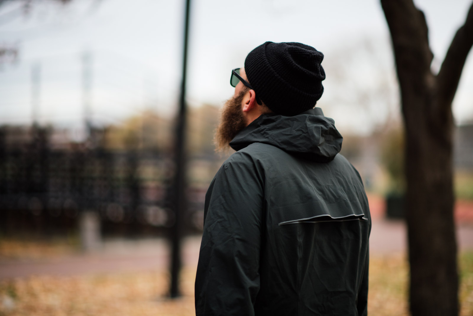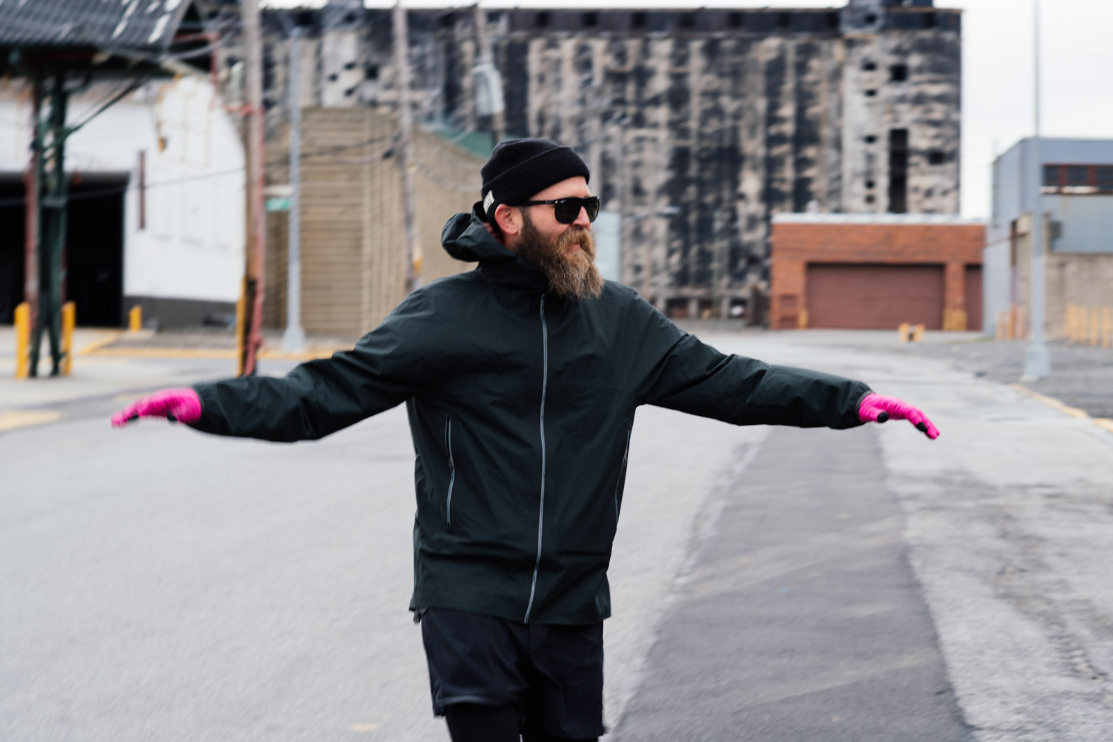 The silhouette of Kenan in motion against Red Hook’s gritty pavements and buildings is a poetic moment of man vs city—especially with the gale-force winds down at the waterfront that day. The highly technical Einn shell in “Onyx,” a slightly warmer black, is a simple and understated form that blended seamlessly into the similarly dirtier Red Hook backdrop. (Close-to-literal seamless—as the waterproof piece is constructed with as few seams as possible.) The lightweight jacket’s best feature is temperature regulation, with back vents for exhaust and mesh fabric hand pockets, paired with a removable insulated layer, meant Kenan was comfortable throughout his run—not too hot or cold.