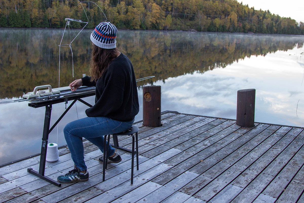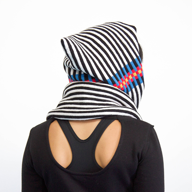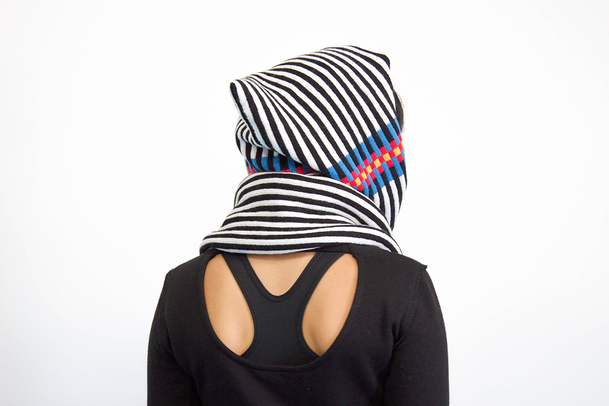 Minneapolis-based textile artist Maggie Thompson has been grappling with ideas, perceptions and systems of authenticity from the moment she was born. With a Native American father and an Irish-German mother, she’s met with questions every step of the way regarding her identity as Native American. The RISD alum (and member of the Fond du Lac Ojibwe tribe) offers answers—through her fine art works—to the challenging limitations of what “native art” should or should not be. Further, Thompson more recently realized that hats and scarfs can make their own subtle statement too, all the while keeping the wearer warm and happy. Her brand, Makwa Studio (“makwa” meaning “bear” in the Ojibwe language; her father’s family belonged to the Makwa Clan), doesn’t make headdresses or so-called “Navajo chic” sweaters. Instead, Thompson knits accessories with unique designs, rooted in her experiences as a modern Native American woman. It’s contemporary, meaningful and above all, extremely wearable.
