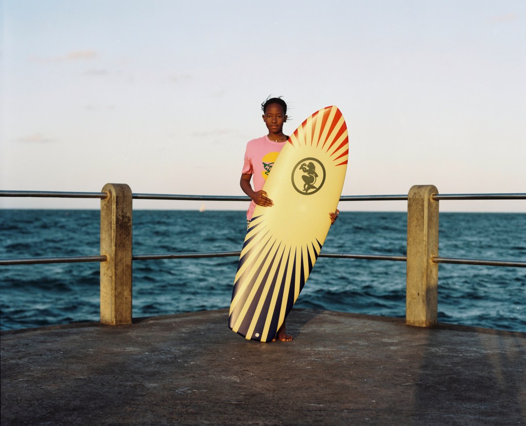 African representation in surf culture and the surfing industry is incredibly rare, despite the earliest recordings of the sport hailing from the 1640s in what is now Ghana. Representation from surf labels attempts to capture this “idyllic goal of wanting to emulate Southern California or Southern Australia or maybe a sprinkle of Hawaii,” Masekela explains. A surfer for over 30 years, Masekela knows how exclusionary the sport is, noting that often in his experience “there is a community that’s sort of waiting to do everything it can to dissuade you from joining.”