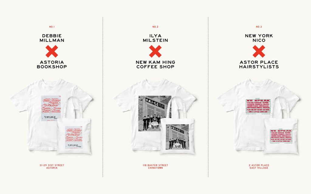 Localized to New York City for the time-being (though there are plans to expand), the first collection celebrates and supports businesses in Queens, Brooklyn and Manhattan: Keg & Lantern, Lighthouse restaurant, New Kam Hing coffee shop, Harlem Doggie Day Spa, Astor Place Hairstylists, and the Astoria Bookshop.