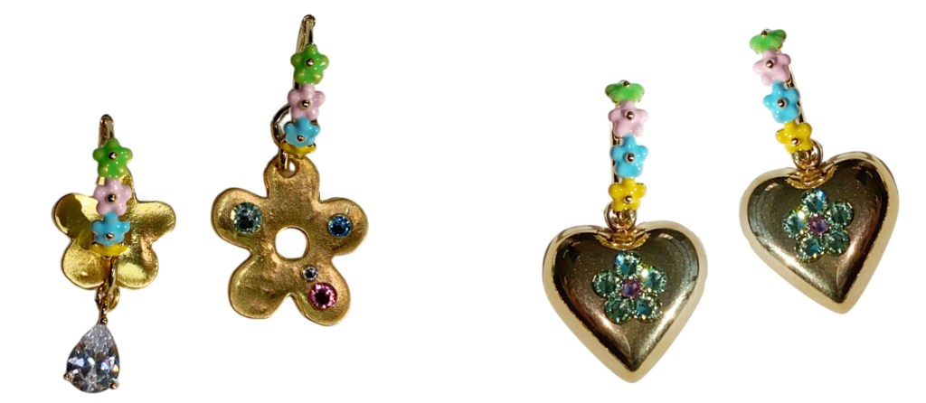 Though the designs are retro, they do maintain refreshed, unique elements. Details like hand-painted florals, visible gems or Swarovski crystals elevate Notte’s fun, relaxed vibe and blend the collection with finer materials. Other times, Tse innovates the way the jewelry is worn. With their signature “Necklacearrings,” for instance, the pendant on the chain can be taken off and worn as a single earring or mixed and matched with another to keep the multitude of styling options from each piece fluid and ever-changing.