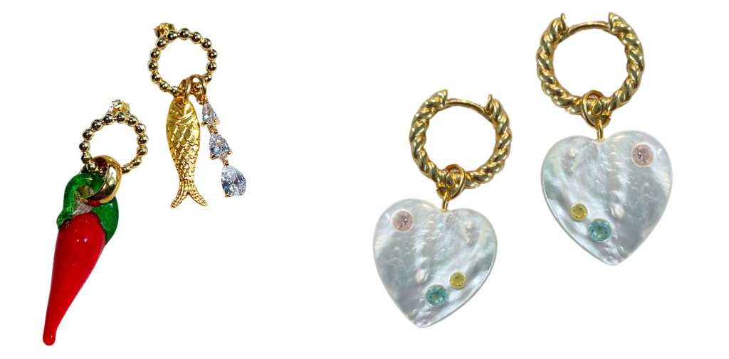 Unexpected moments and asymmetrical pairings often appear in Notte’s pieces as a way to maximize its bold, playful style. Tse tells us, “Jewelry, for me, is just an expression. I never take my jewelry to be like, ‘I can only do a set or I can only have like the necklace a certain way.’ I want the customer to be able to choose whatever they want. A lot of our styles are sold as singles, so they don’t have to commit to a pair or they can mix and match different color options.” Often, the earrings that are sold as a pair feature differing elements, like the Hand On My Heart Earrings which see one side with a heart pendant and another with a hand or the Moody Baby Earrings which have one smiley face heart and another frowning face. At the end of the day, Tse tells us, “We just want the customer to have fun.”