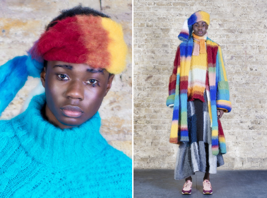 London-based label KA WA KEY‘s gender-inclusive collection comprises several colorful knitwear garments, cut-and-sew blazers and beanies, and plenty of patterns. The wool-dominated FW21 presentation references the eccentricity of characters like Willy Wonka and the Mad Hatter, translating their odd personas into layered wool ensembles and boucle tops and bottoms.