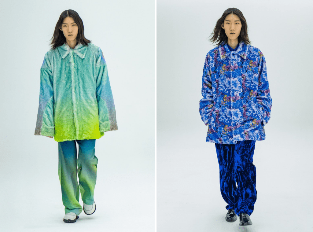 Matching sets make up most of the FW21 collection from designer Kee Kim’s menswear label, KEENKEE, from which there are plenty of statement pieces. Ombre coats pair with shiny pants, and all-over floral prints juxtapose tie-dyed velvet pants. Altogether the collection proves far-reaching. There are pieces within that cater to plenty of styles, especially if you’re someone seeking garments in optimistic tones.