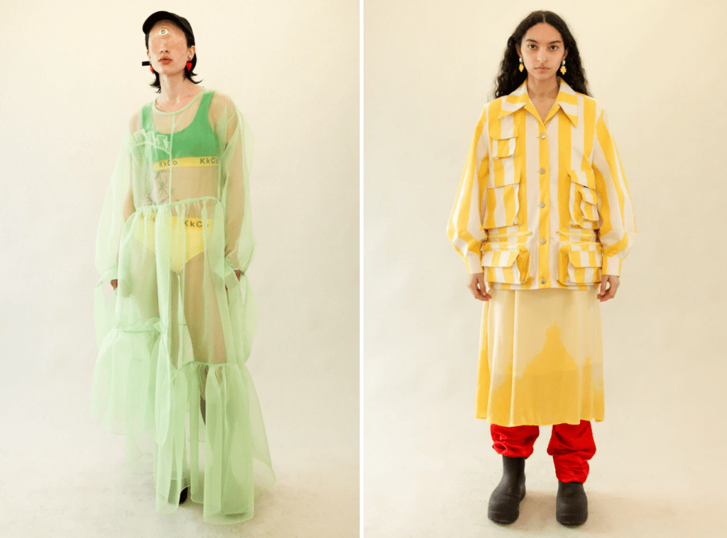 “After 12 months of being cut off from the real world—we’ve created our own,” designer Kara Jubin explains in a statement preceding her label KkCo’s NYFW presentation. Surreal yet stylish, the collection comprises colors, clashing prints, clever silhouettes, and, on multiple occasions, cyclopic models, adding even more magic to the otherworldly offering. It’s a playful collection with serious design prowess.