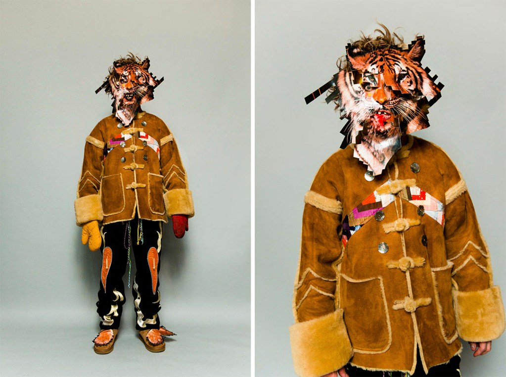 The artist’s contribution to Gao’s lookbook appears as decorative headdresses and masks and clever adornments for the models’ hands and feet. In some instances, the additions contrast Gao’s designs; in other moments, the decorations amplify the collage-like madness of it all.