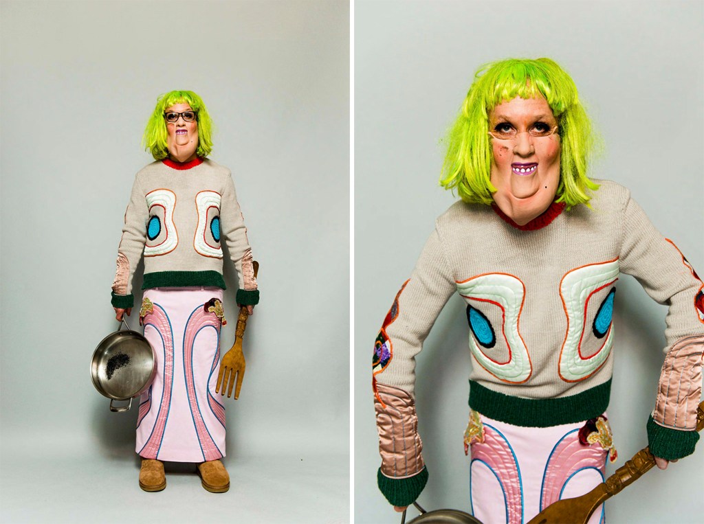Fusing her Chinese heritage and her unique Western experience, Gao aimed to recreate the ethos of the wearable art movement that burgeoned in the 1970s in her first two collections. For autumn/winter 2020, Gao doubles down on her vision by inviting New York-based mixed medium artist David Henry Brown Jr to collaborate on the collection’s lookbook. Known for his dark, almost dystopian style, Brown Jr (under the moniker David Nobody) uses recognizable canned foods and sodas, doll appendages, wigs, and debris to contort the faces found in his portraiture work.