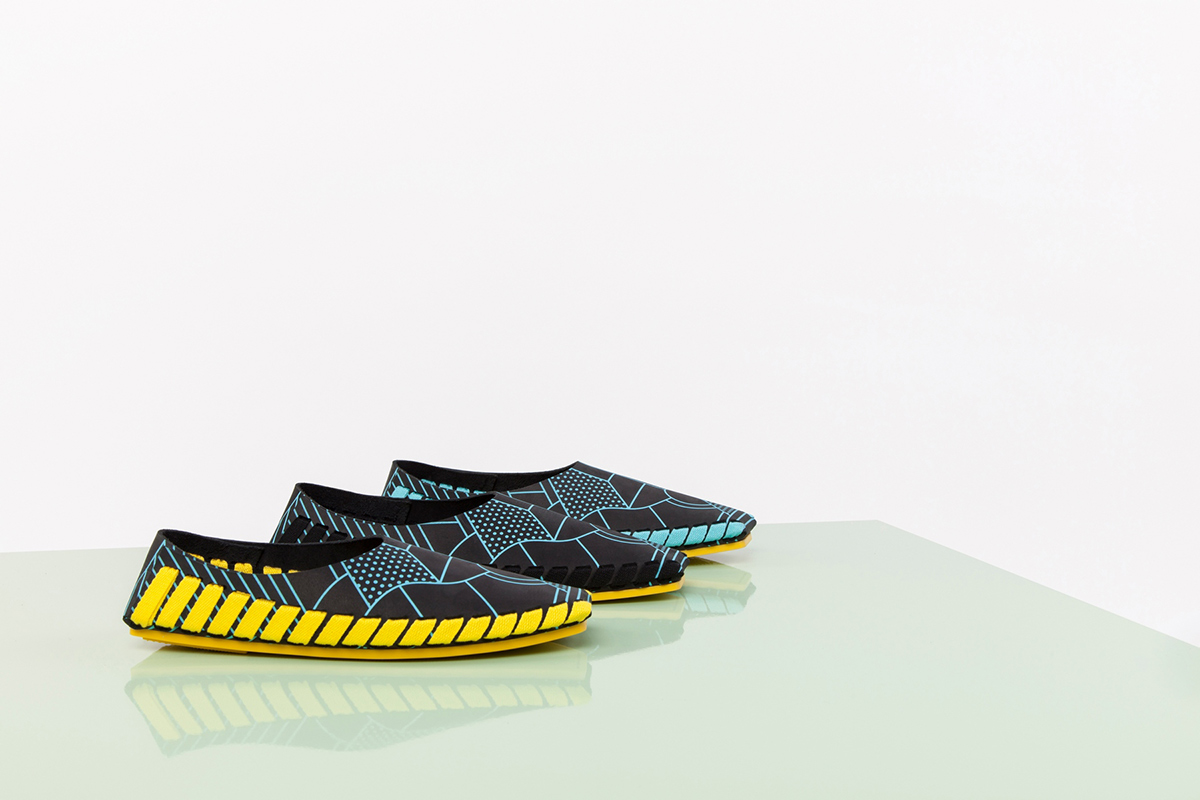 The already unusual flat-packed leather footwear gets a graphic kick in this new collaboration