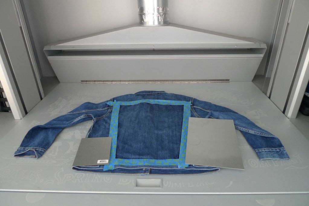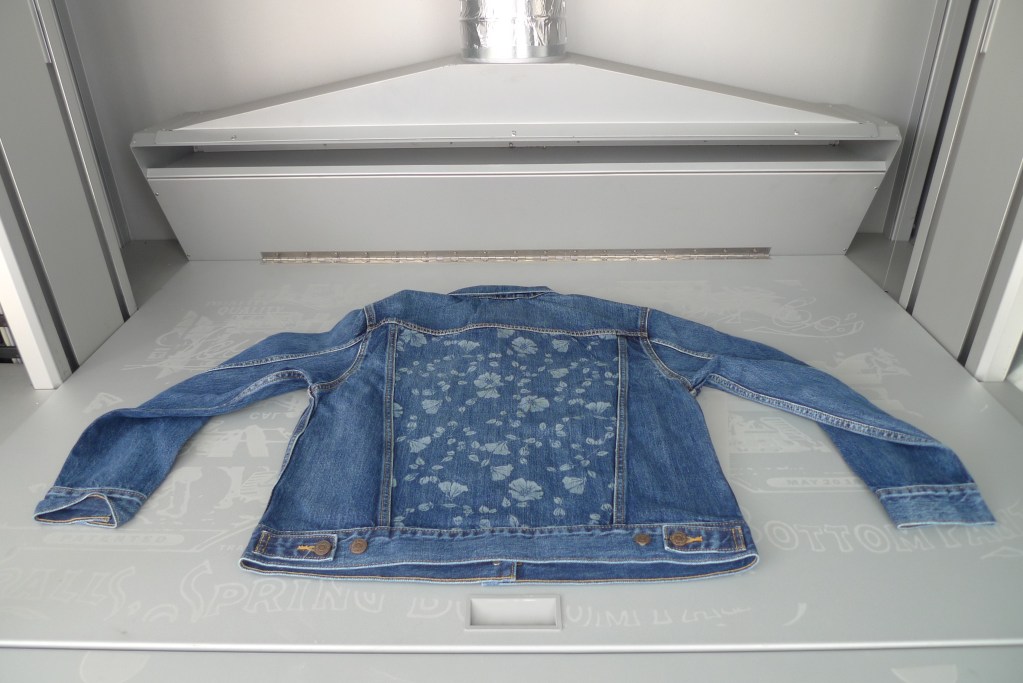 In the next room sits a giant grey box with a shelf to lay down jeans under the Jeanologia laser. A technician inputs the specifications and sets the process in motion. The laser moves back and forth, from the hem up through the waistband, embedding the embellishments to the jeans. An indigo-colored smoke rises up from spot the laser hits the denim and wafts into the ventilation like a cartoon magic trick. For shreds and tears, the machine pinpoints the spot on the jeans and lights a tiny flame to destroy the fabric. For jeans, they laser-alter one leg then the other. For a trucker jacket, a logo or pattern can be added onto the back-panel from left to right in 90 seconds. Next, they take the jeans to the washroom to finish off the customization process.
