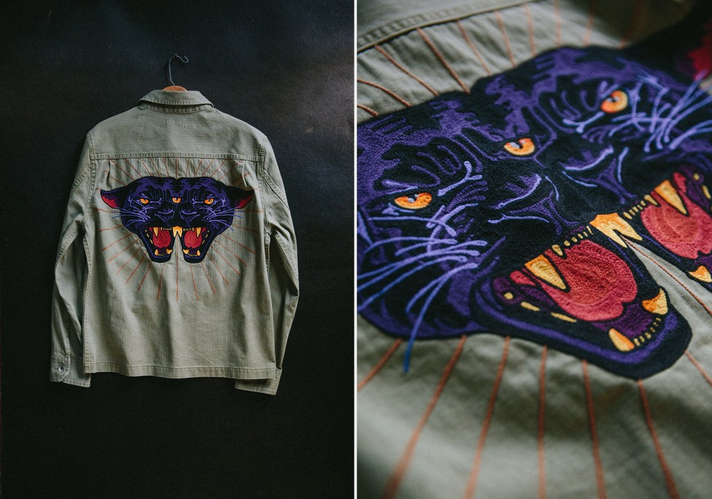 All the embroidered designs adorn the same product: Taylor Stitch‘s classic HBT Jacket—a boxy, utilitarian overshirt made for all genders. Composed of 8.5-ounce 100% organic cotton, the garments are heavy and durable, but have been washed once for softness.