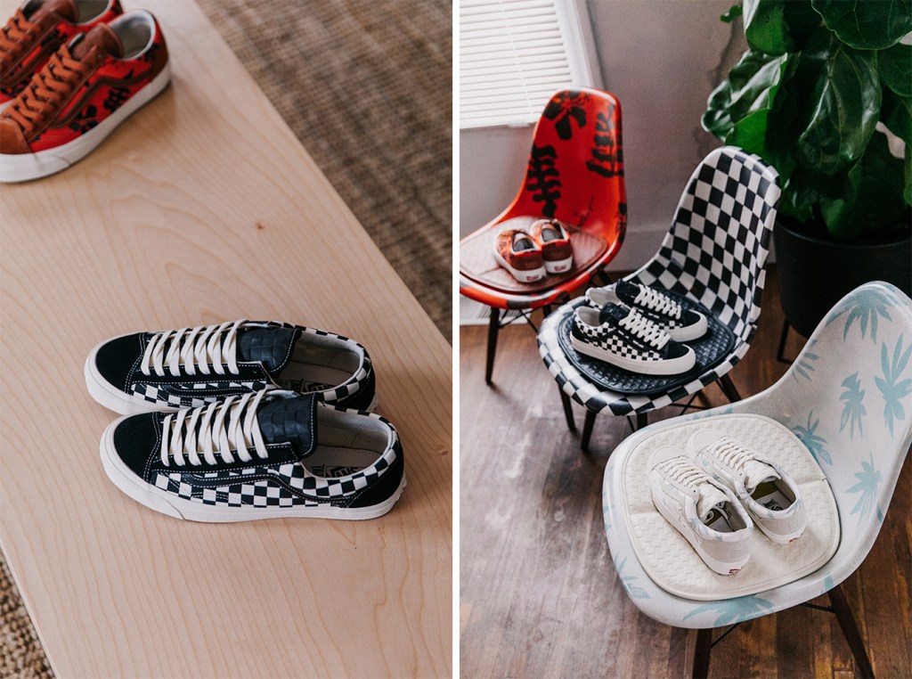 Inside furniture brand Modernica‘s DTLA factory (their home since launch in 1989), co-founder Jay Novak and marketing lead Ingrid Hernandez-Morrison join Vans VP of Footwear Design Mark Haskins to unveil a Vault by Vans collaborative capsule collection. It’s most certainly one of the skate brand’s finest—reissuing their Style 36 LX and OG Slip-On LX silhouettes while lending three archival prints to Modernica for matching fiberglass shell chairs. Unsurprisingly, both feature their iconic checkered motif, blue palm pattern and orange Hawaiian print.