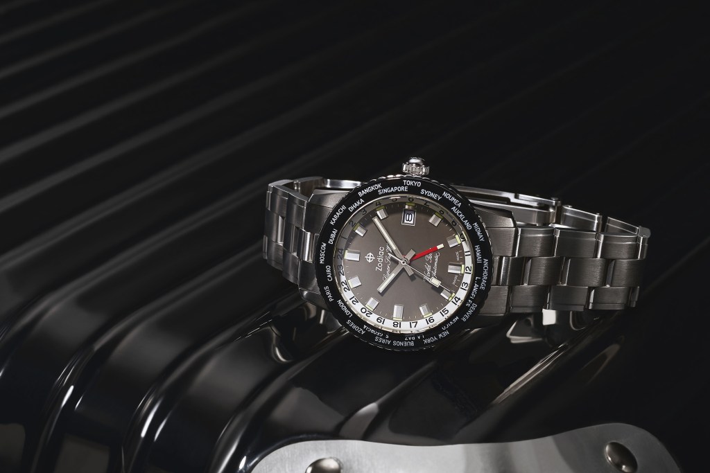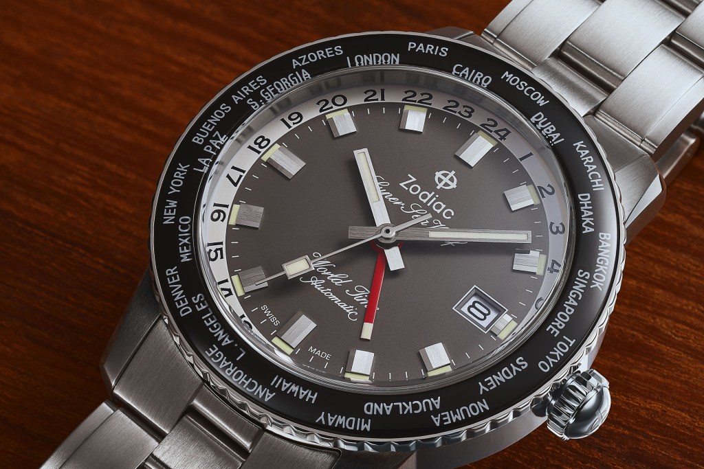 Anyone familiar with the Zodiac catalogue will see design signatures from their Sea Wolf diver model, as well, which they introduced back in 1953, even earlier than the original Super Sea Wolf. It’s an apt correlation, as these new timepieces deliver 200 meters of water resistance. That, coupled with superluminova on the indices, makes this a worthy dive watch itself. Further, attributes like the red GMT hand contribute to a sense of legibility. And the 24-hour time ring hones in on day/night tracking. In light of this abundance of features, it’s still an intuitive read.