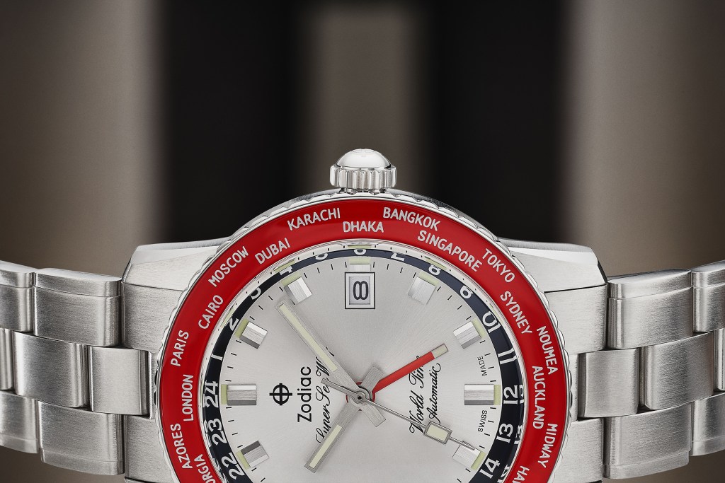 With their new Limited Edition Super Sea Wolf World Time Automatic Stainless Steel Watch collection, the historic Swiss brand Zodiac looked to their illustrious legacy to revive a classic design and apply fresh flourishes. Originally introduced in 1970, the Super Sea Wolf World Time became an icon of international travel for its stylish utility. The wristwatch pairs a traditional universal Greenwich Mean Time (GMT) indicator with a bi-directional rotating bezel that nods to 24 global cities. With a quick glance, wearers can track two timezones at once—and easily switch to others.